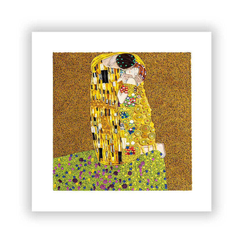 Introducing our breathtakingly quilled wall art inspired by Gustav Klimt’s most iconic work, “The Kiss.” The oil and gold leaf painting has long been celebrated for its depiction of human connection and intimacy. Dating back to 1907, The Kiss is considered to be the height of Klimt’s “Golden Period” when the artist’s technique of combining gold leaf with oil paint introduced a new level of opulence to the Art Nouveau movement.