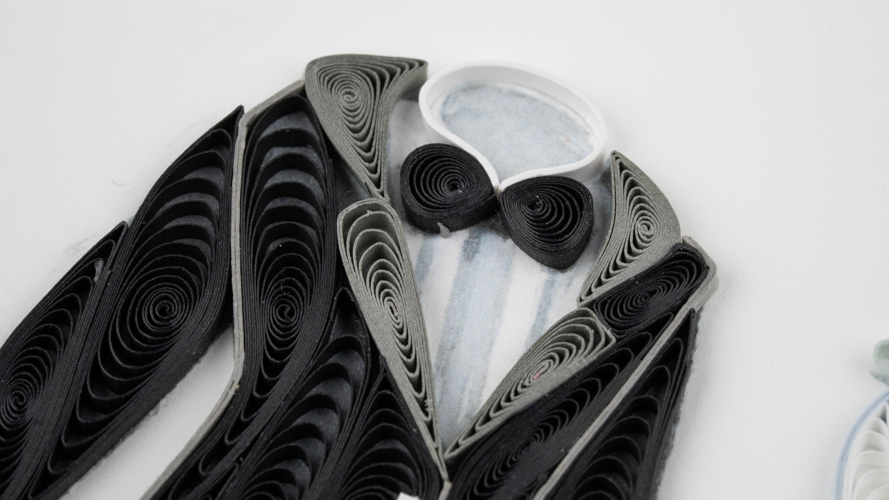 Celebrate love in style with this exquisite hand-quilled wedding card. Delicate paper strips form an elegant tuxedo and gown, capturing the romance and sophistication of the big day. A timeless keepsake for newlyweds.