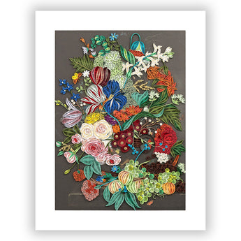 Introducing our awe-inspiring quilled wall art piece of “Still Life with Flowers and Fruit” by Dutch still life artist, Jan van Huysum. Very few artists in the Dutch Golden Age could rival Huysum’s ability to capture the dynamic energy of an abundant array of flora and fruit subjects in his still lifes. "Still Life with Flowers and Fruit" fills the entire canvas, utilizing nearly every centimeter and maximizing the quality and attention to detail with every stroke. What set van Huysum apart from his contemporaries was his highly secretive ability to blend and apply his colors, giving his paintings a traceable uniqueness only known to him.