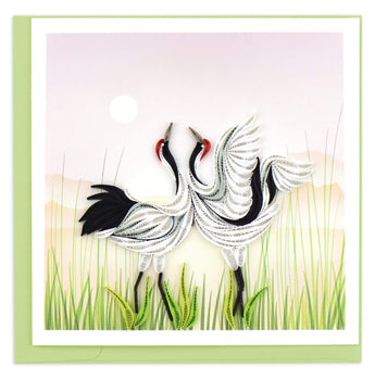 Send a Quilled Cranes Greeting Card to your friend or loved one for any occasion! Cranes symbolize happiness, longevity, and good fortune making them the perfect card to send to a friend or loved one! The handcrafted card depicts two white, black and red cranes facing one another with their heads looking up. They are standing in tall green grass with a sunset printed background.