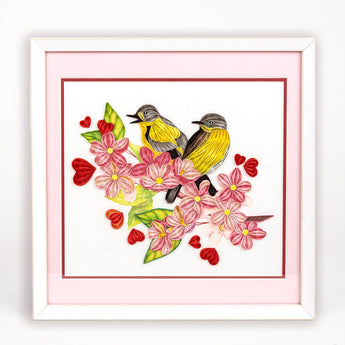 "Blossoming Lovebirds" celebrates the beauty of partnership and the blossoming of feelings. This limited edition quilled wall art is a true testament to the artistry of quilling, capturing the subtleties of emotion through delicate lines and vibrant hues.
