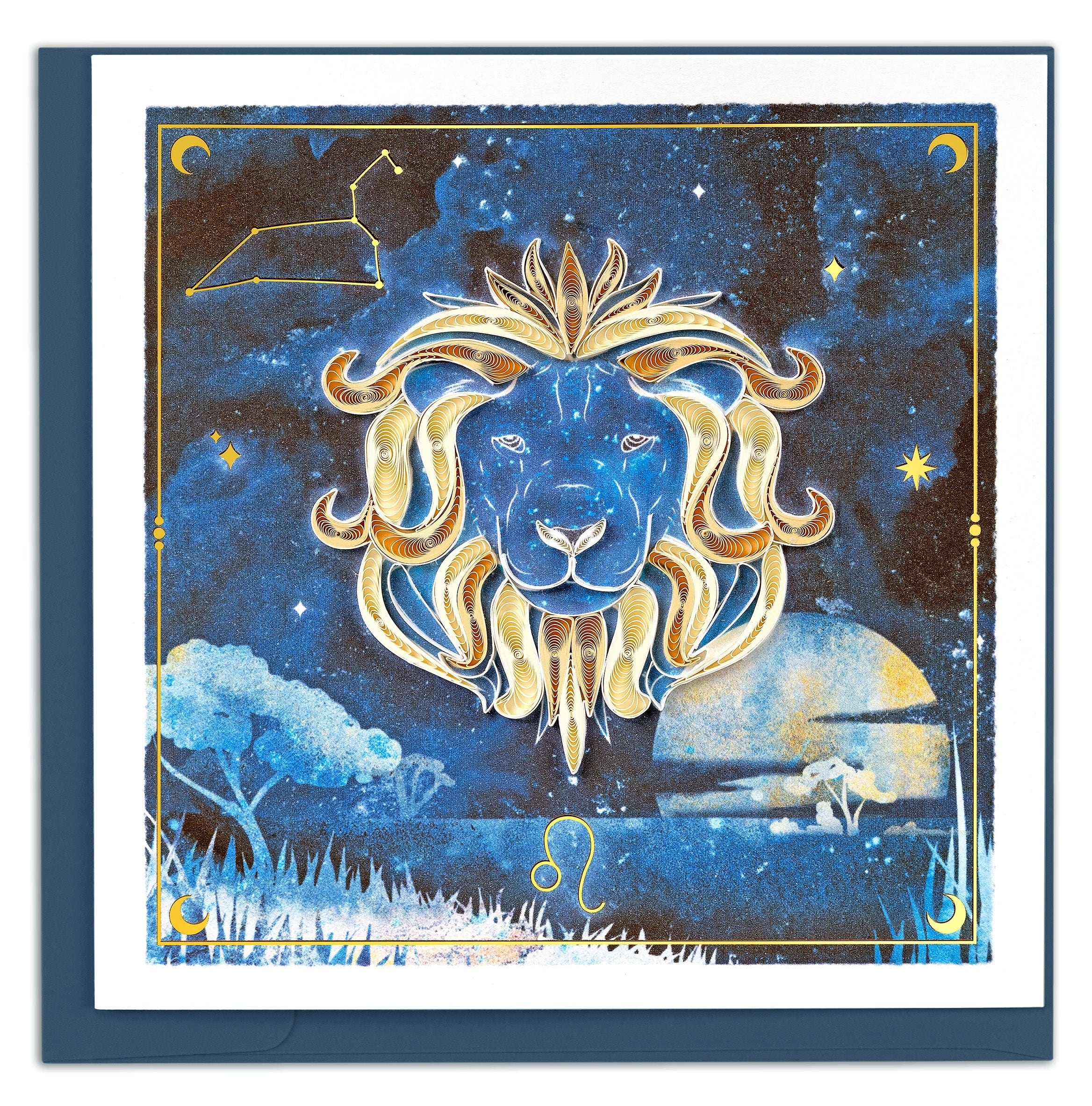 Shine a spotlight on the regal Leo with this stunning quilled and gold foiled greeting card. The dark navy blue constellation background and a cream colored quilled design of a lion  captures the essence of this zodiac sign’s leadership. Perfect for birthdays or any celebratory occasion, this card is an ideal way to honor the Leo in your lifeWhether it’s for  friend, partner, or family member, this card is sure to impress and delight with its striking design.