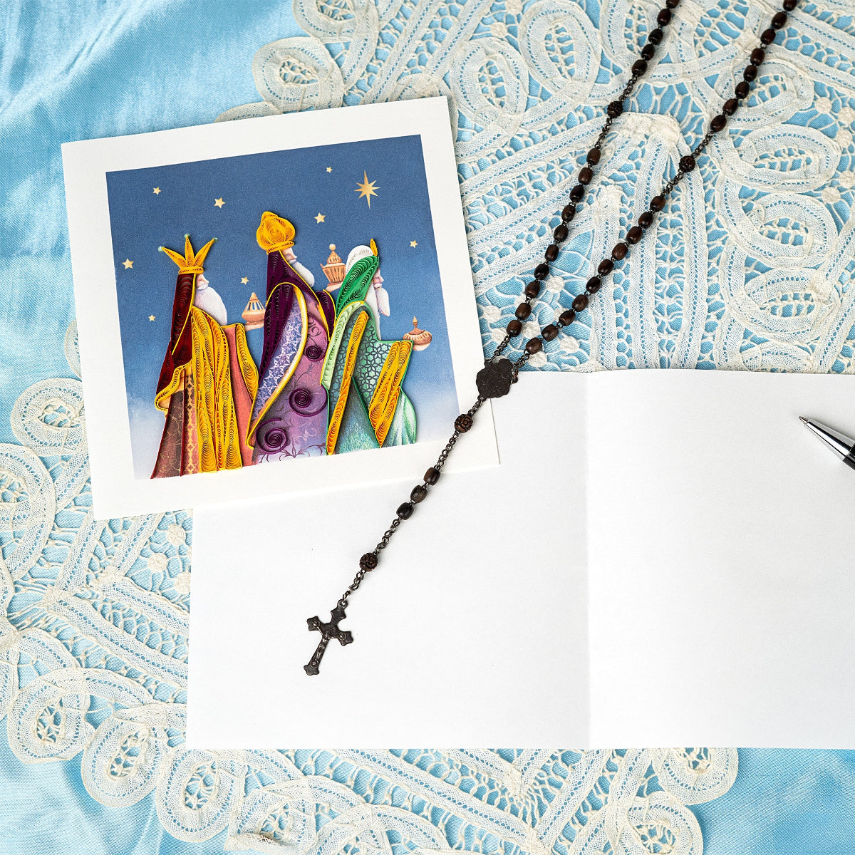 Rejoice with the handcrafted three Wiseman card. The quilling on their cloaks truly stands out to draw you into to the deeper meaning of the card.