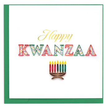 Celebrate African American cultural heritage by sending the Quilled Happy Kwanzaa Greeting Card. This design features the word "Happy Kwanzaa" made up of various greens, blues, yellows, reds, and gold foil. A small Kinara also sits along the bottom of the card.