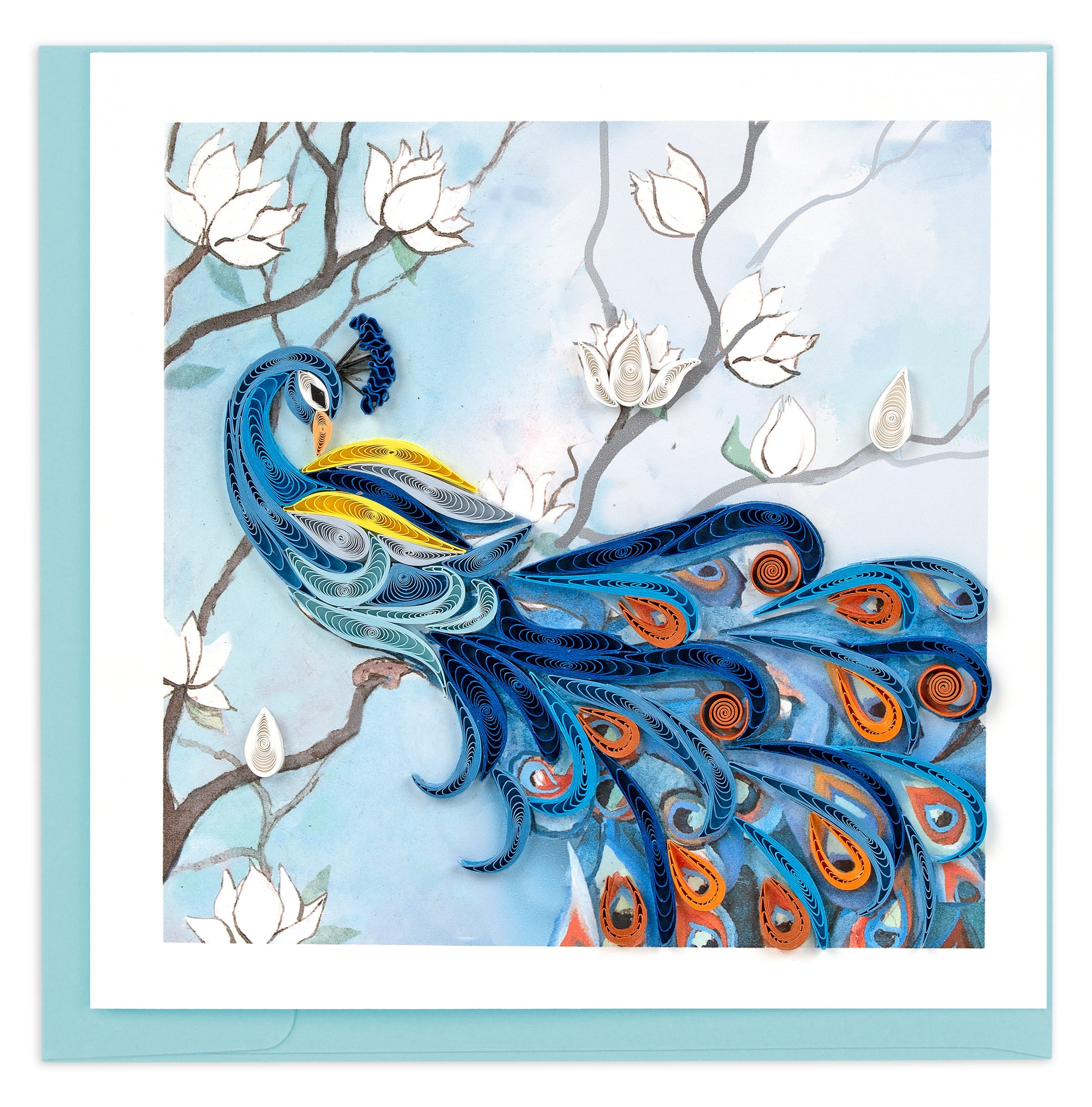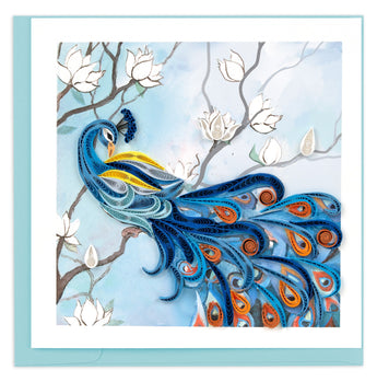 A stunning hand-quilled peacock takes center stage, adorned with delicate white flowers that frame its magnificent plumage. Each intricate curl and layer of paper is meticulously crafted to capture the bird's natural elegance. Perfect for celebrating life's special moments with a touch of artisanal beauty and timeless sophistication.