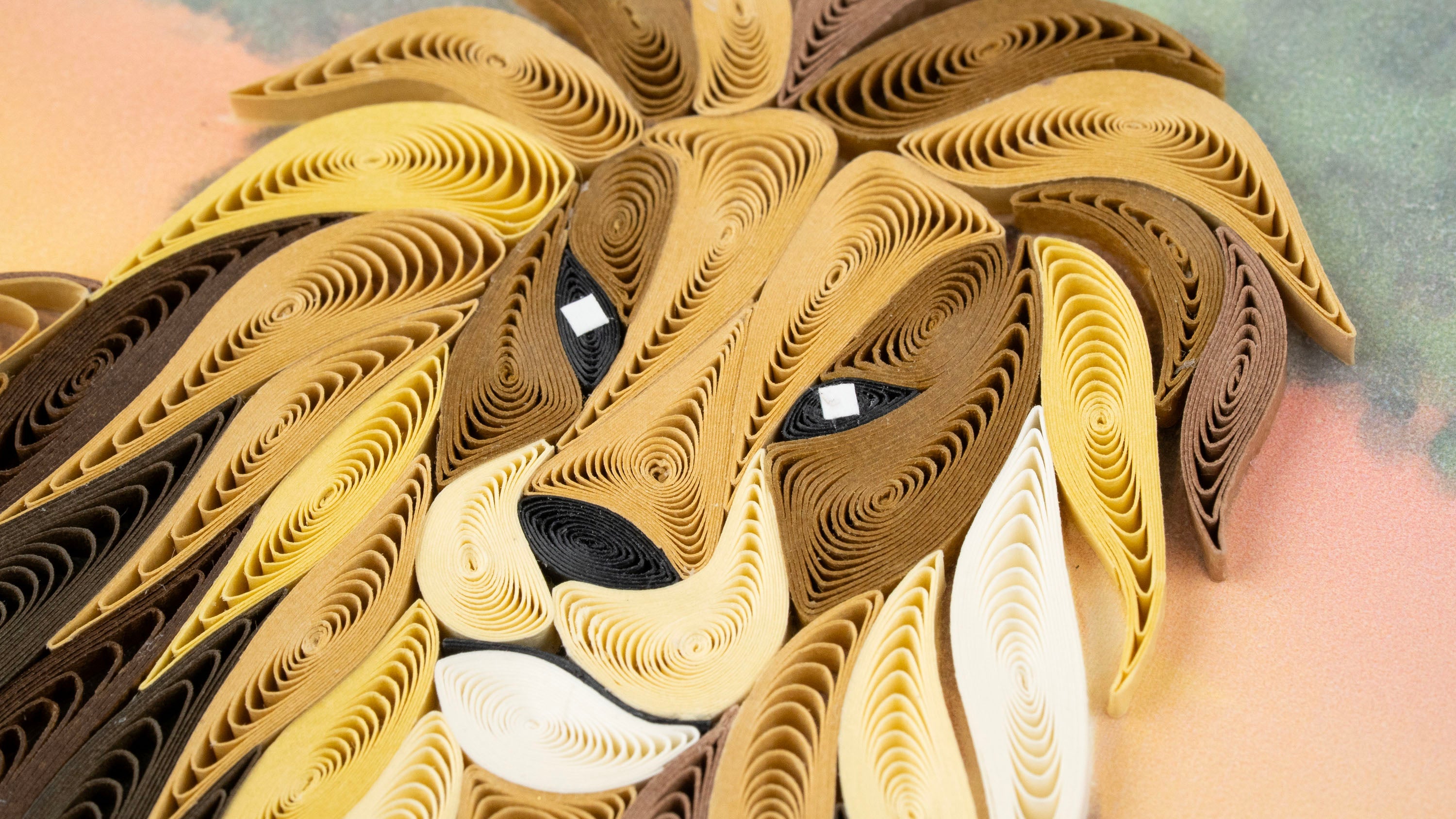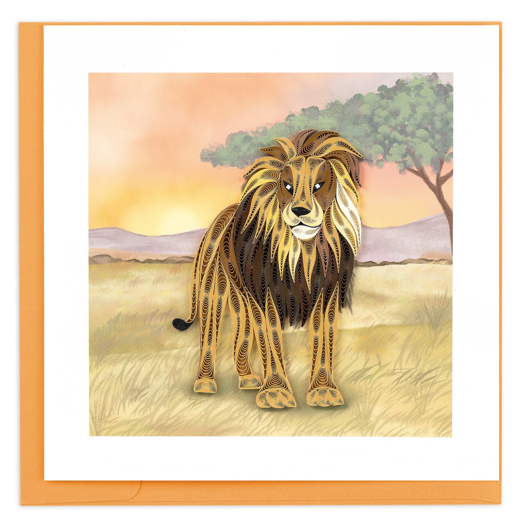 Majestic quilled lion emerges from layered paper in warm golds and rich earth tones. Each delicate coil captures the wild spirit of the savanna, bringing dimensional artistry to your greeting. A striking statement piece for wildlife lovers and art enthusiasts alike.