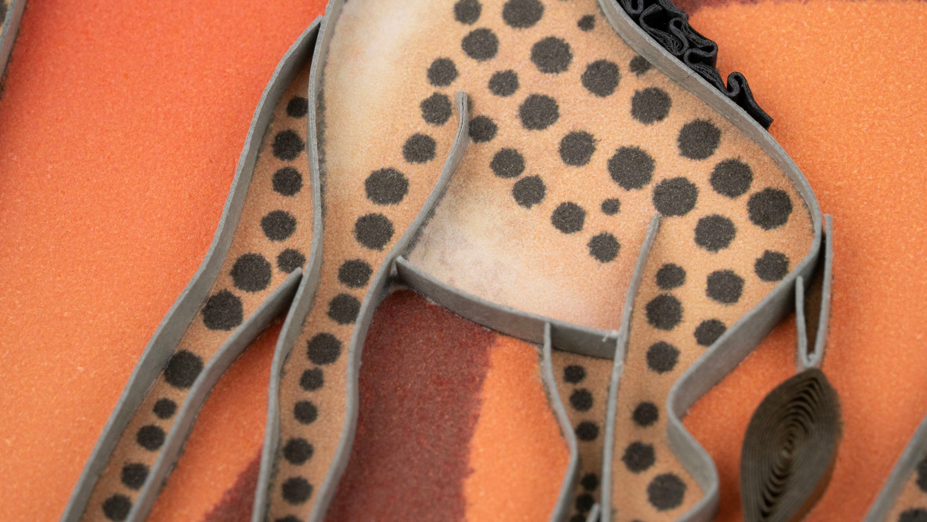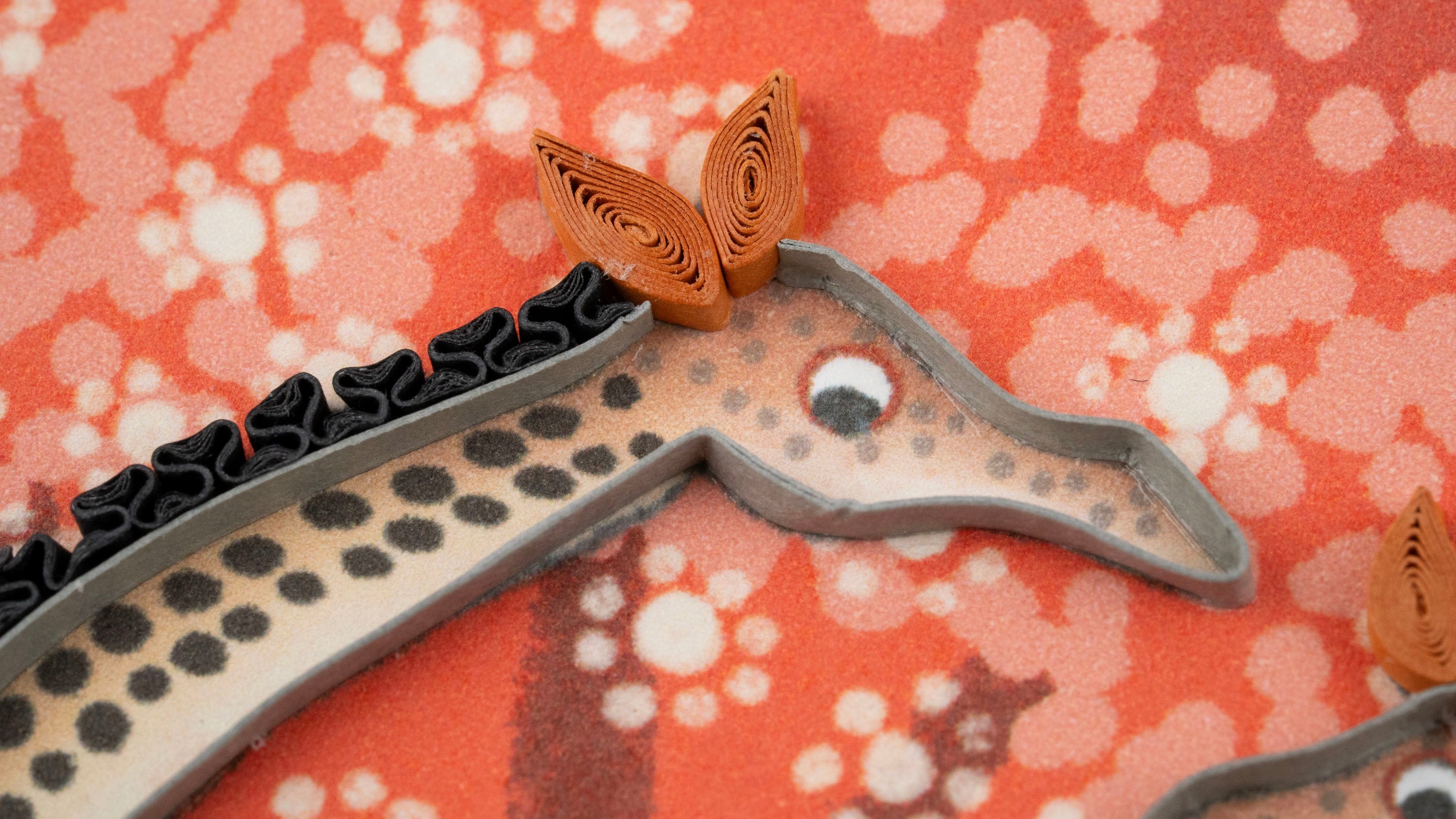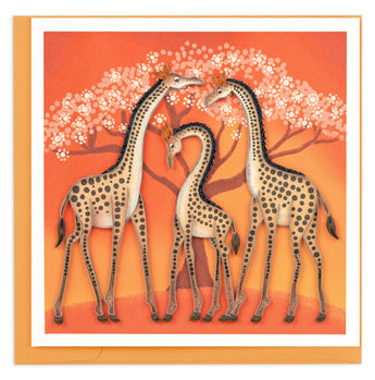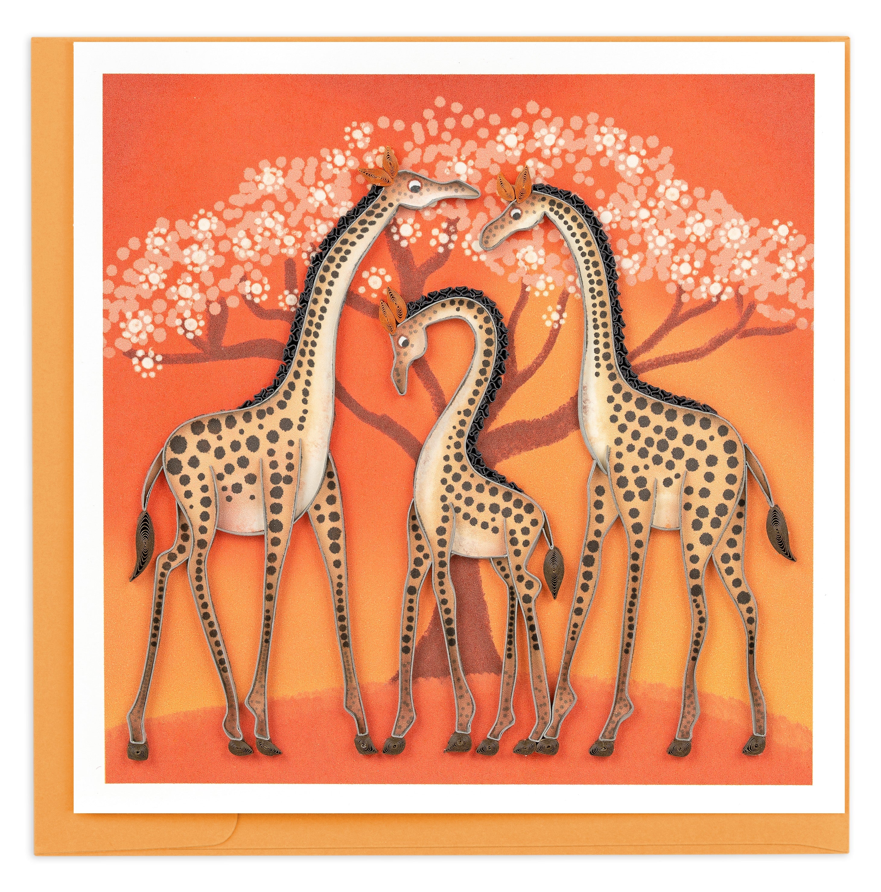 Graceful giraffes rendered in vibrant Tinga Tinga style, meticulously hand-quilled into dimensional layers. This striking greeting card celebrates bold African artistry with intricate paper craftsmanship. Perfect for nature lovers and art enthusiasts seeking a distinctive, handmade card that makes a memorable impression.