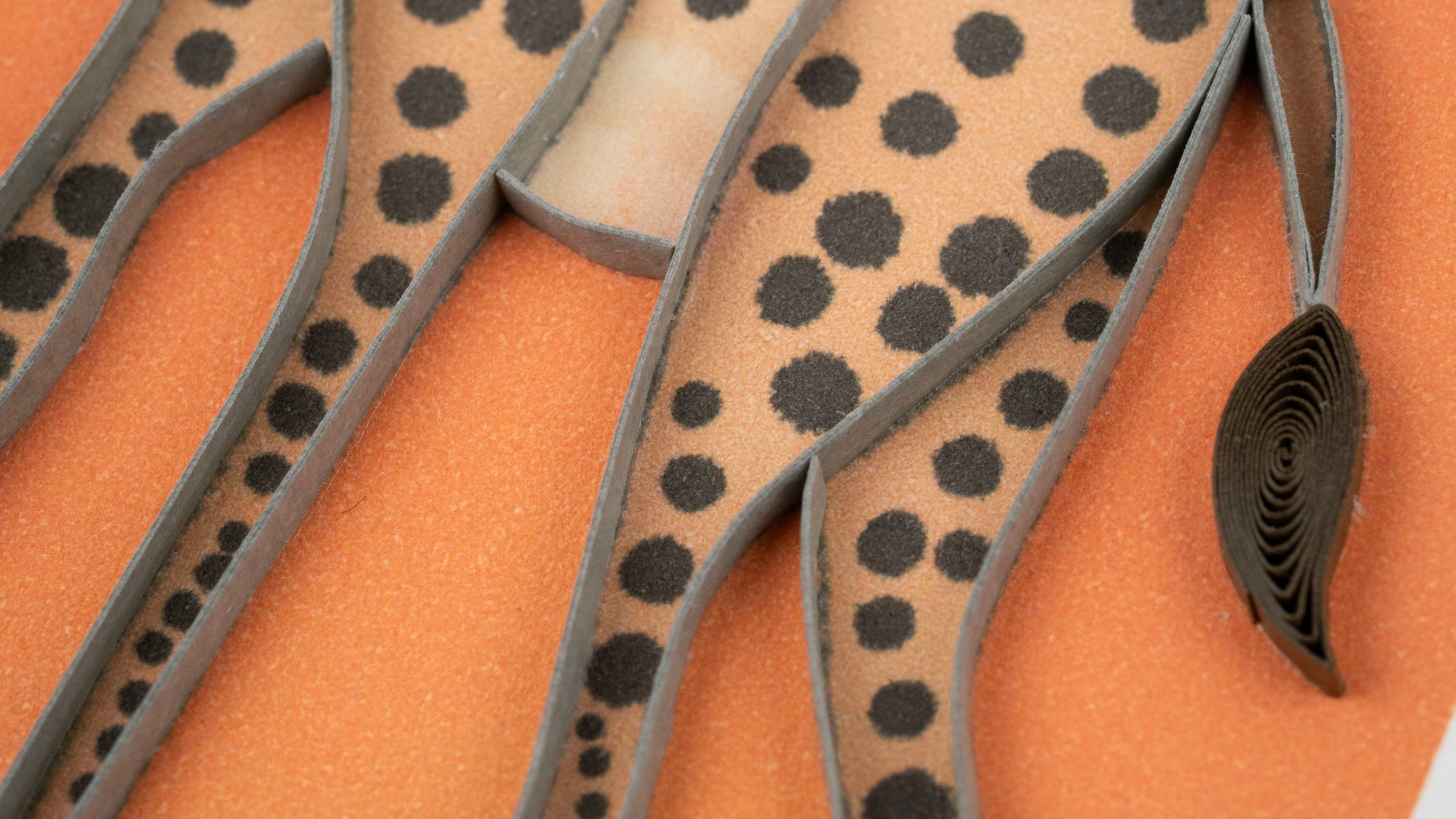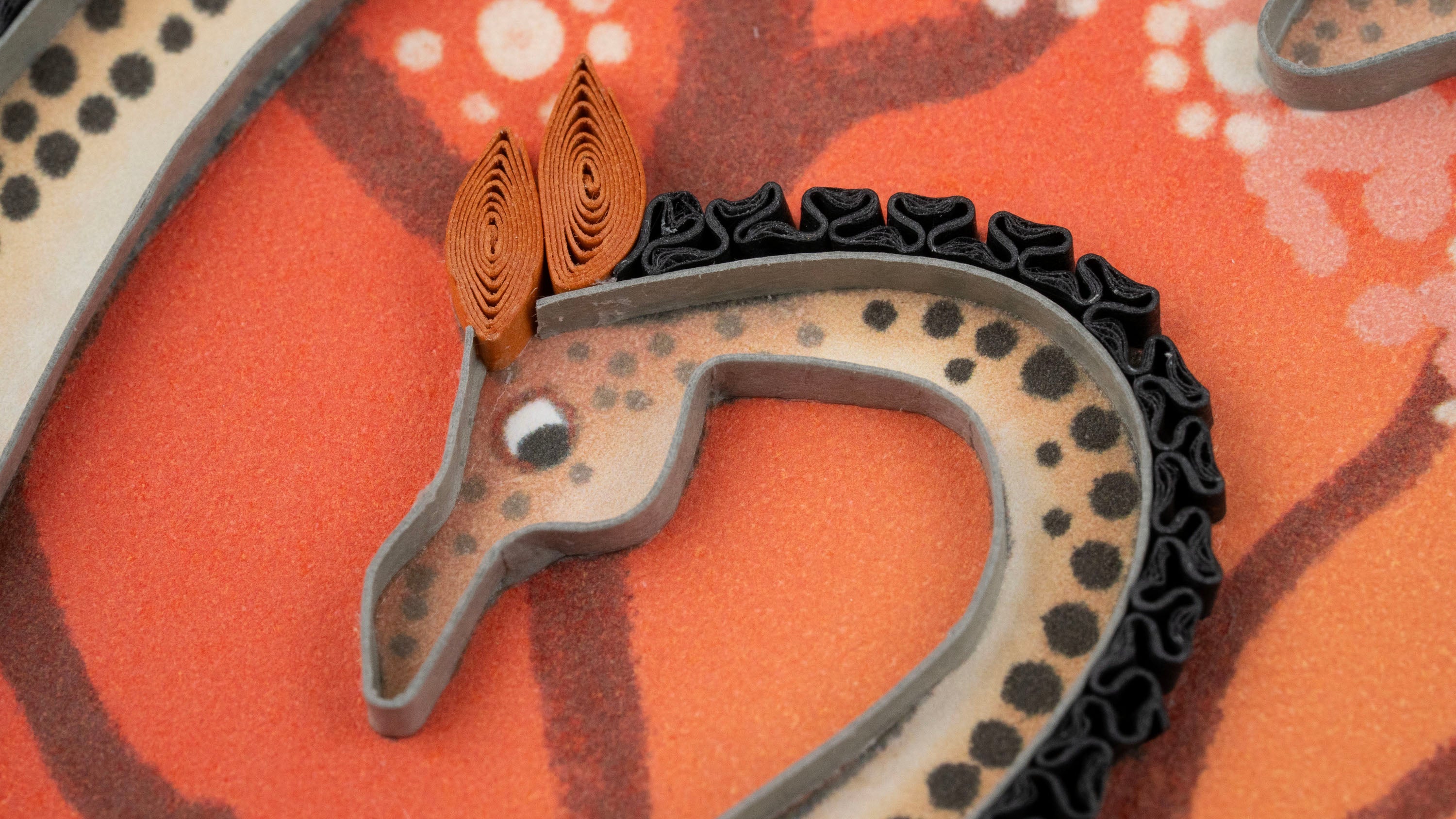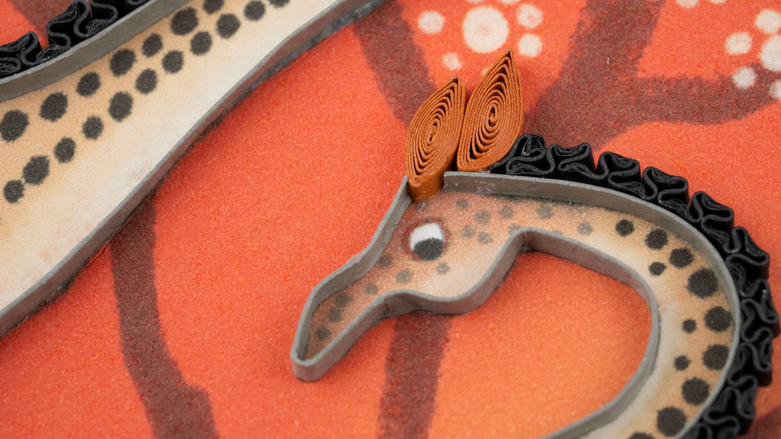 Graceful giraffes rendered in vibrant Tinga Tinga style, meticulously hand-quilled into dimensional layers. This striking greeting card celebrates bold African artistry with intricate paper craftsmanship. Perfect for nature lovers and art enthusiasts seeking a distinctive, handmade card that makes a memorable impression.