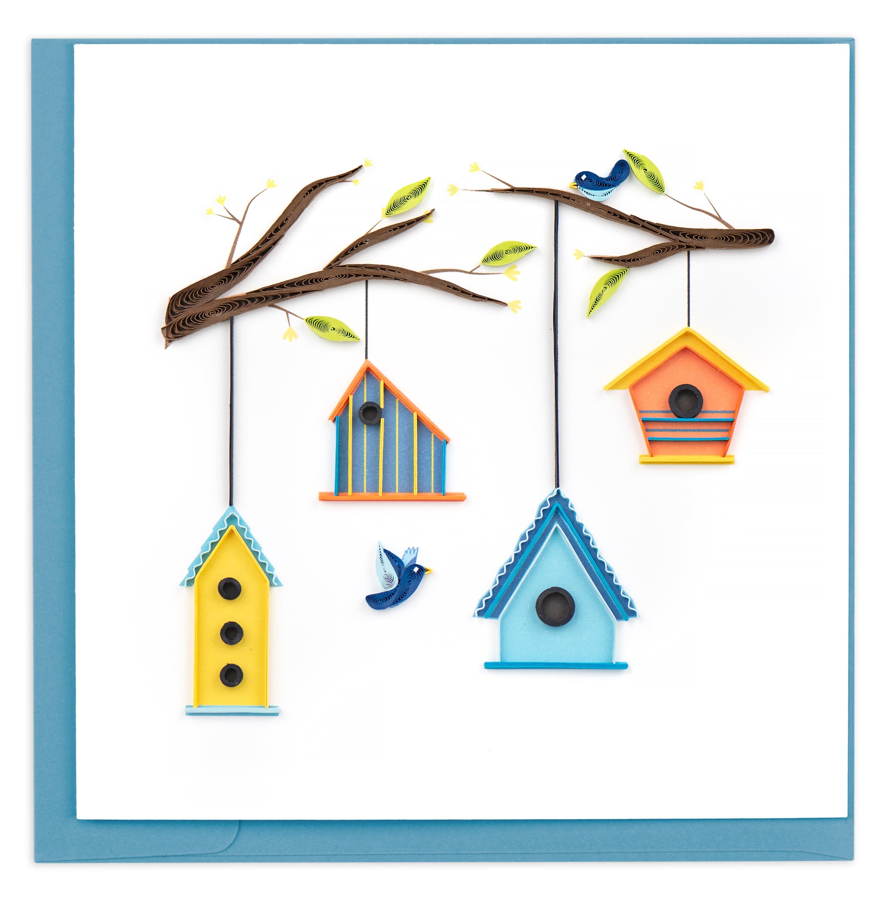 Send this beautiful quilled card to a bird lover in your life just because! This card makes a great addition to any bird enthusiast's home or a nice card to send for any occasion especially in spring! The design features brown tree branches with four colorful and modern bird houses hanging from them in hues of blue, orange and yellow. Two little blue quilled birds flutter and perch near by.