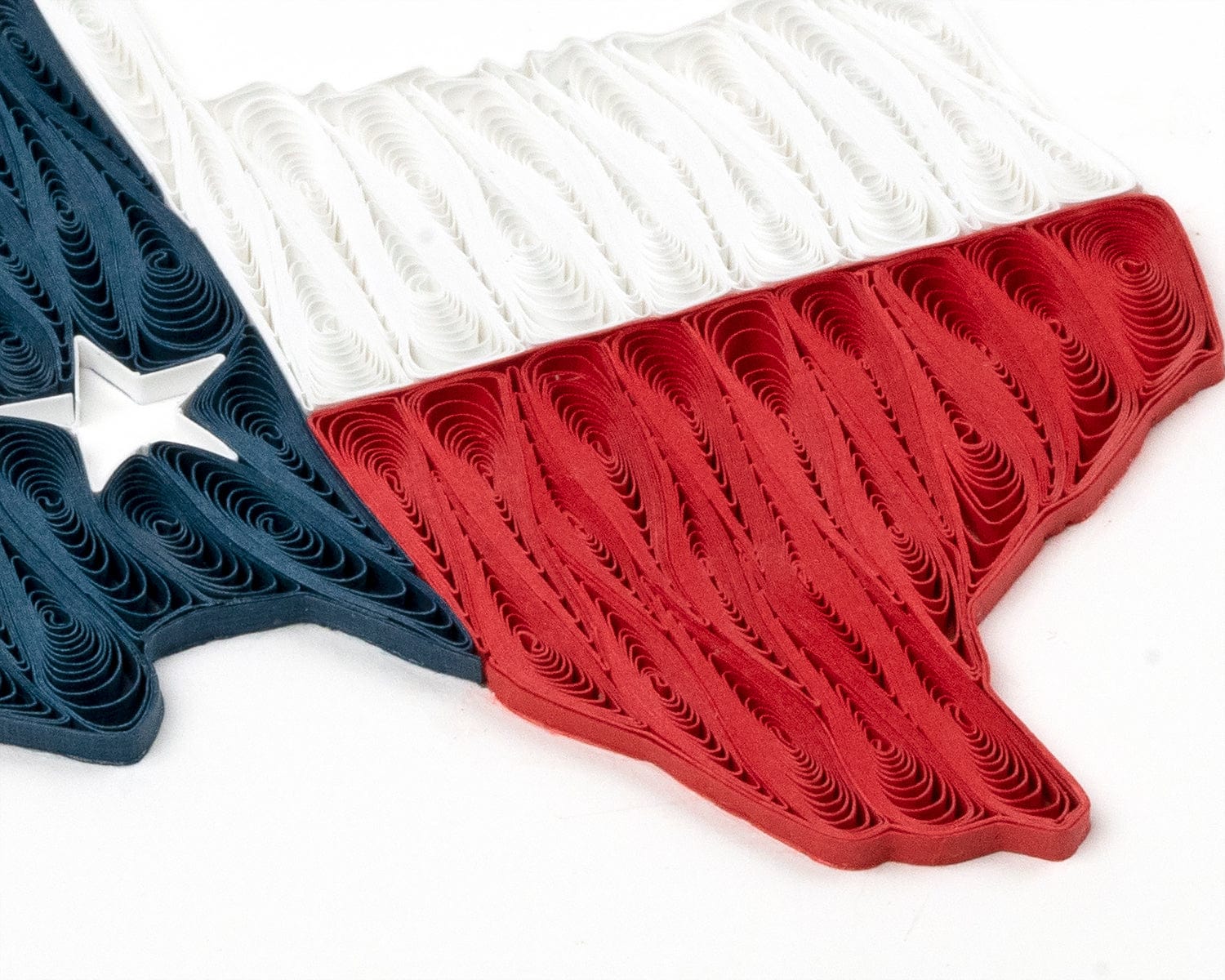 Everything is bigger and better in Texas and this quilled card is no exception! Send this card to a friend or loved one who loves Texas. The greeting card features the outline of the state of Texas filled with solid quills to make up the Texas flag design in white, navy and red.
