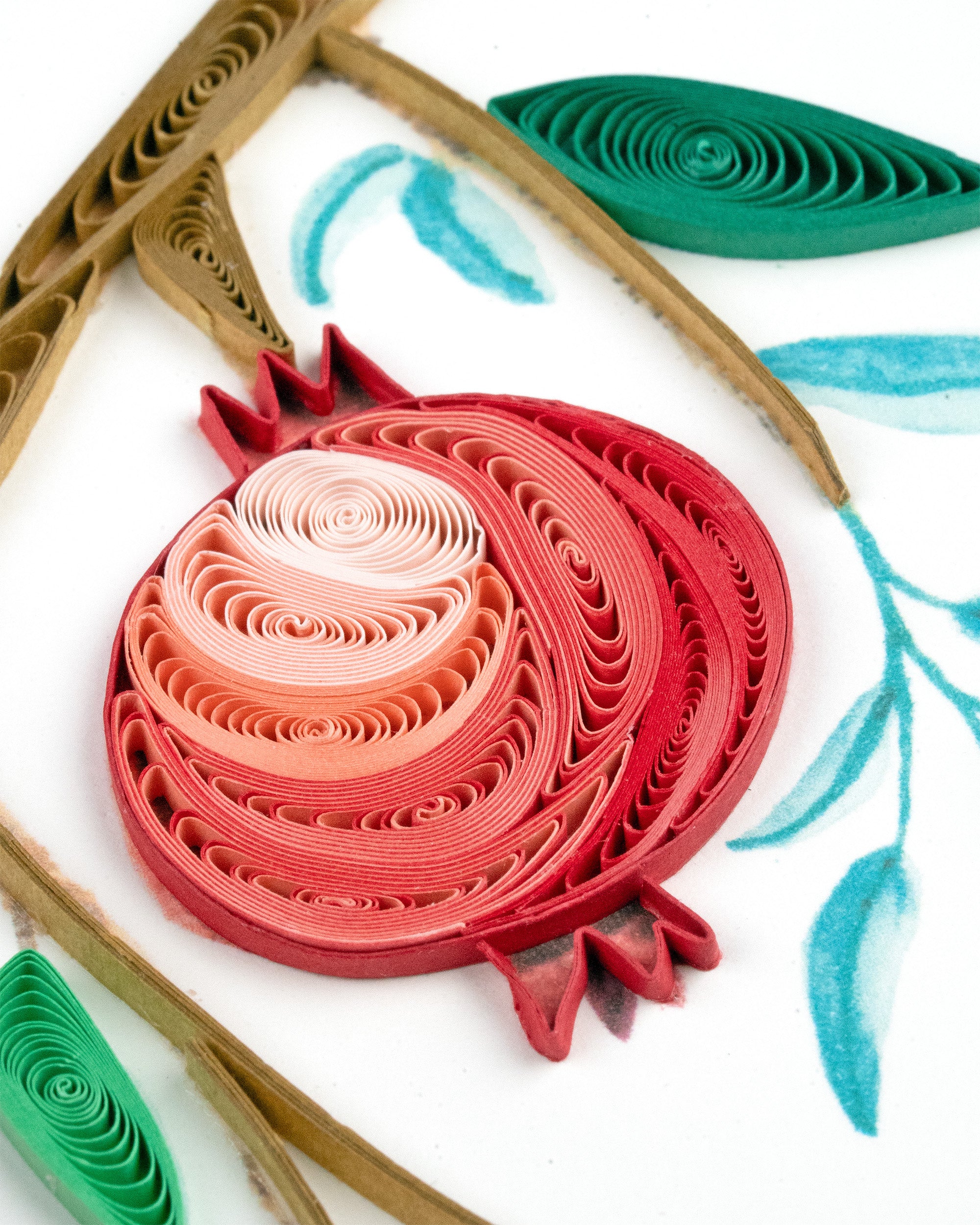Embrace the richness of nature with this quilled greeting card featuring a pomegranate branch. Handcrafted with intricate detail, the vibrant red pomegranates and lush green leaves create a stunning design. Perfect for any occasion, this card is a beautiful way to share your heartfelt messages with a touch of elegance.