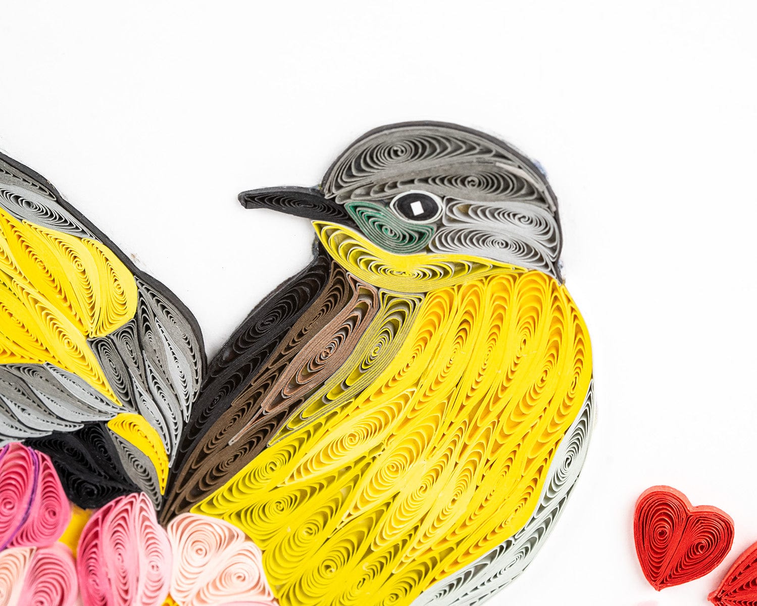 "Blossoming Lovebirds" celebrates the beauty of partnership and the blossoming of feelings. This limited edition quilled wall art is a true testament to the artistry of quilling, capturing the subtleties of emotion through delicate lines and vibrant hues.