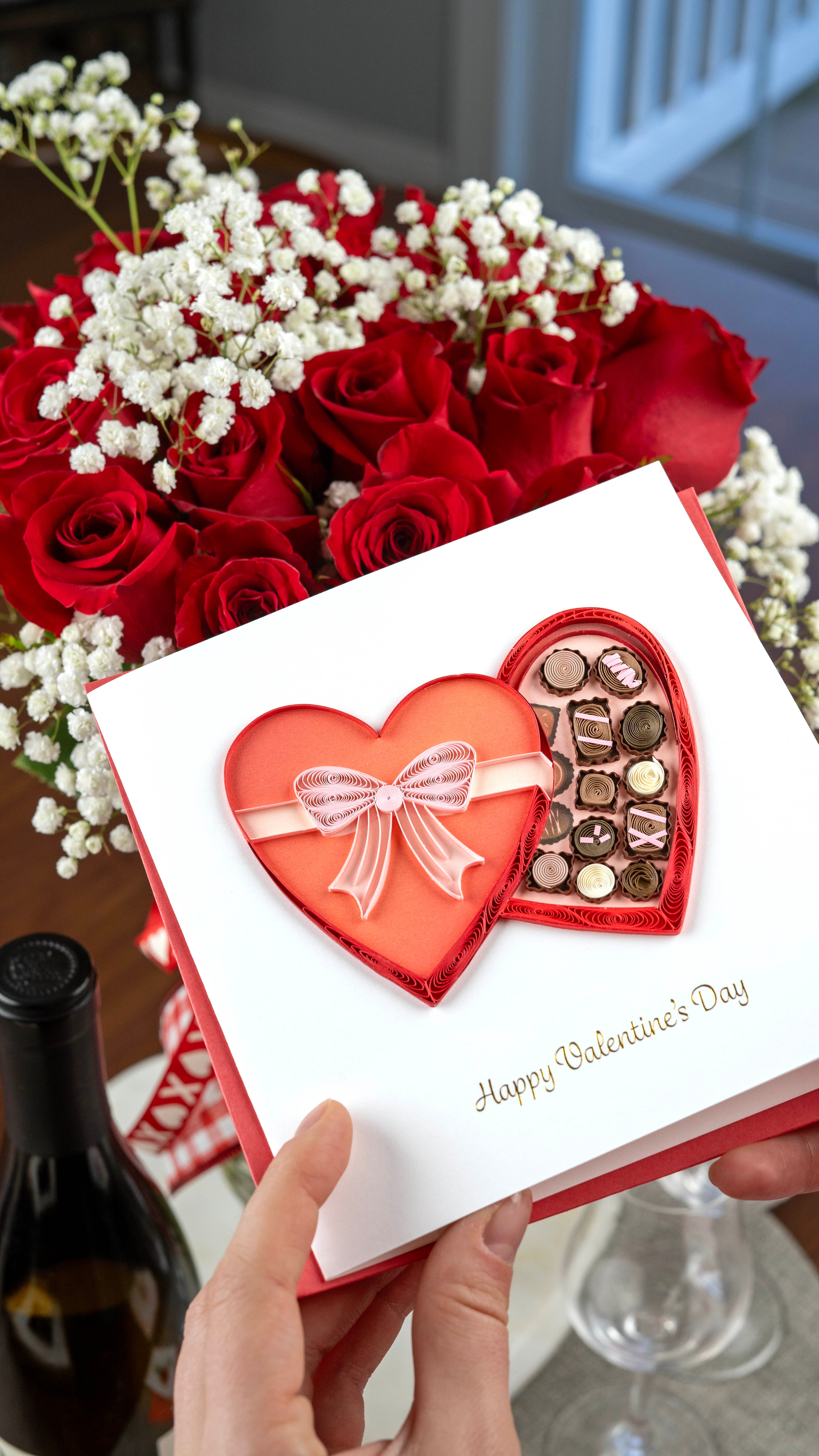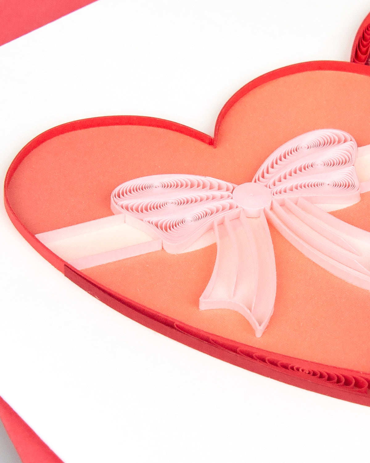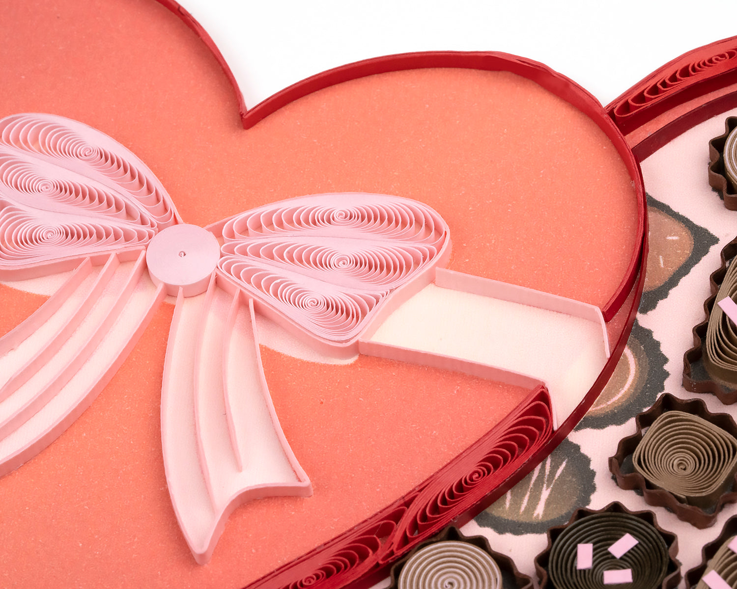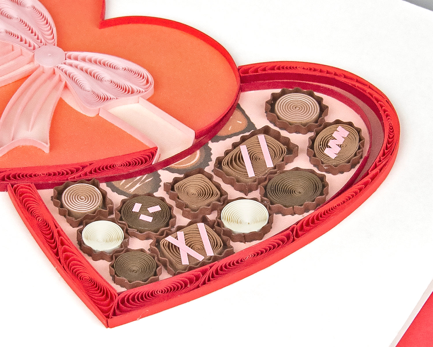 Sometimes love is like a box of chocolates! Give your loved one the Quilled Box of Chocolates Valentine’s Day Card. The artwork features a heart-shaped box of chocolates with a pink bow. The words “Happy Valentine’s Day” are written in pink below.