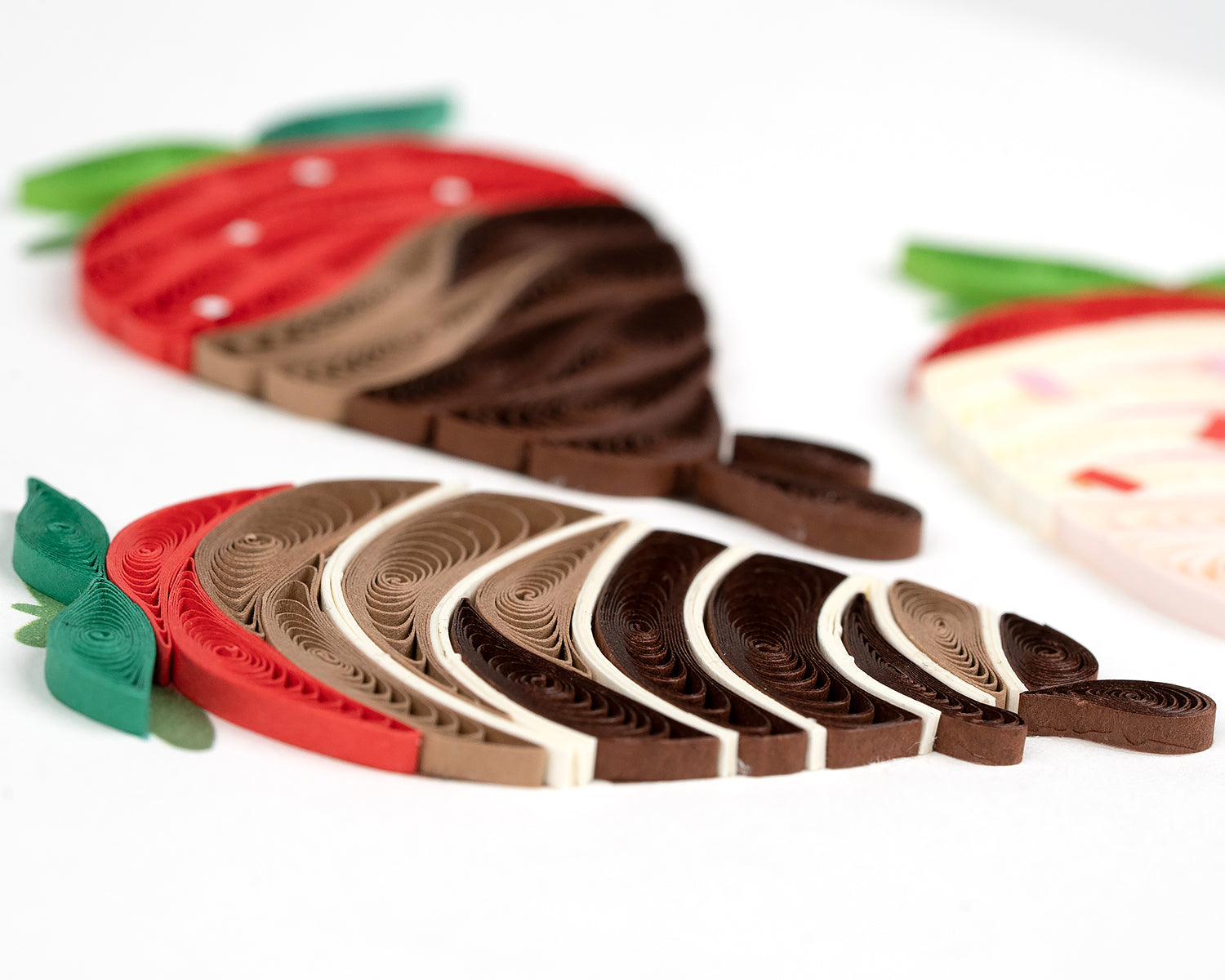 This quilled Valentine's Day card is a unique way to let your loved one know you care. The three handmade delicious chocolate covered strawberries are a sweet treat that they will cherish forever. The card features three strawberries covered in dark, milk and white chocolate.