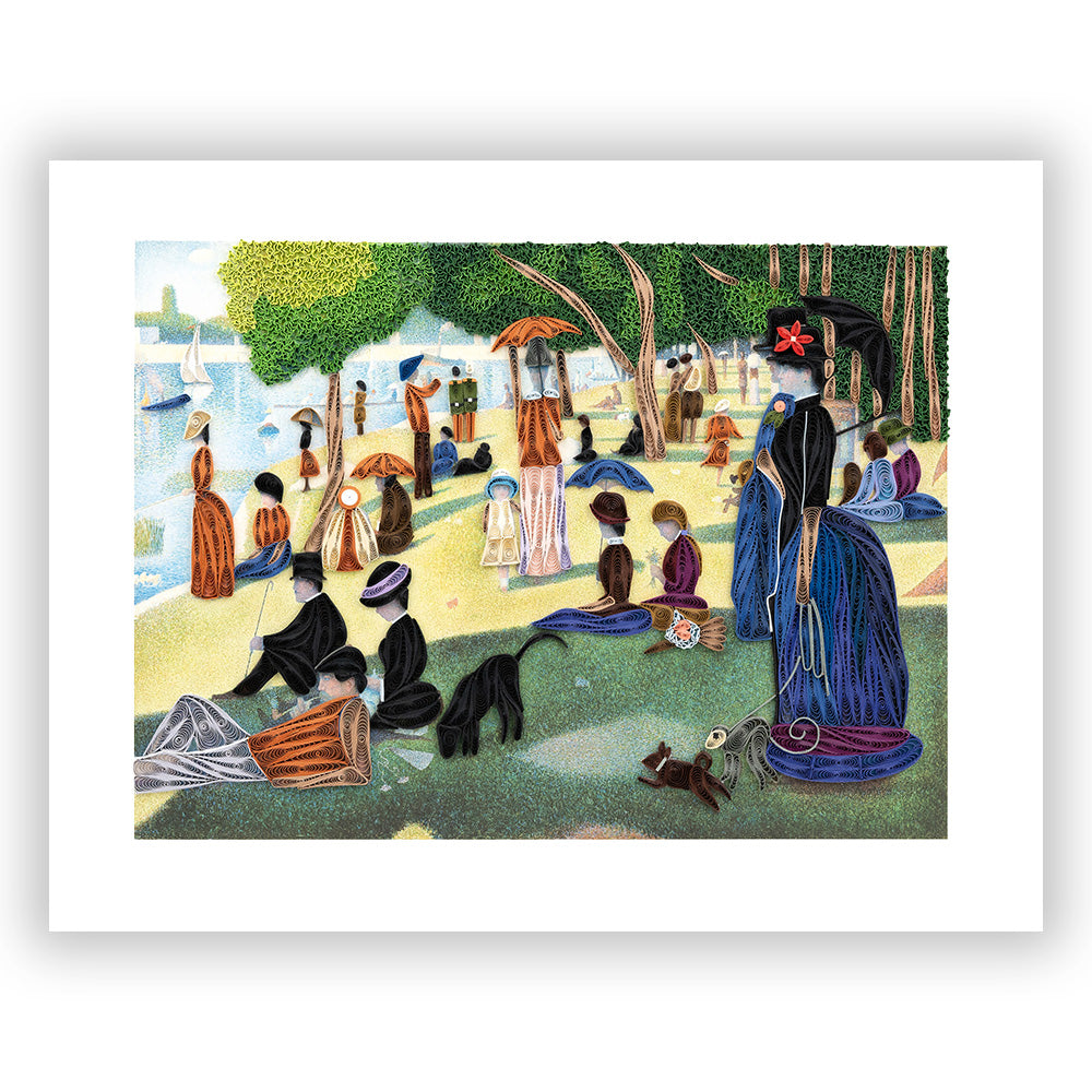 Introducing our captivating quilled wall art inspired by Georges Seurat's iconic masterpiece, "A Sunday Afternoon on the Island of La Grande Jatte," his most well-known and largest painting. Using pointillism, Seurat depicts people from different social classes strolling and relaxing in the park. This piece is said to be a founding work of the neo-impressionist movement.