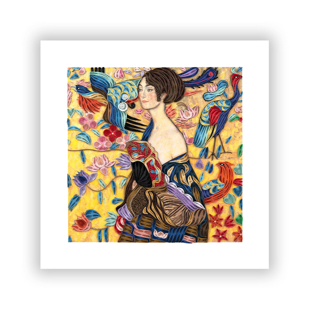 "Lady with Fan" is one of the last masterpieces completed by Klimt before his passing. Throughout his career, Klimt became renowned for his distinctive interpretations of the female figure, and this artwork stands as a testament to his artistic prowess. Klimt was considered a symbolist painter and is thought to have been heavily inspired by Japonisme which can be noted in this work by the Japanese style kimono dress and fan.