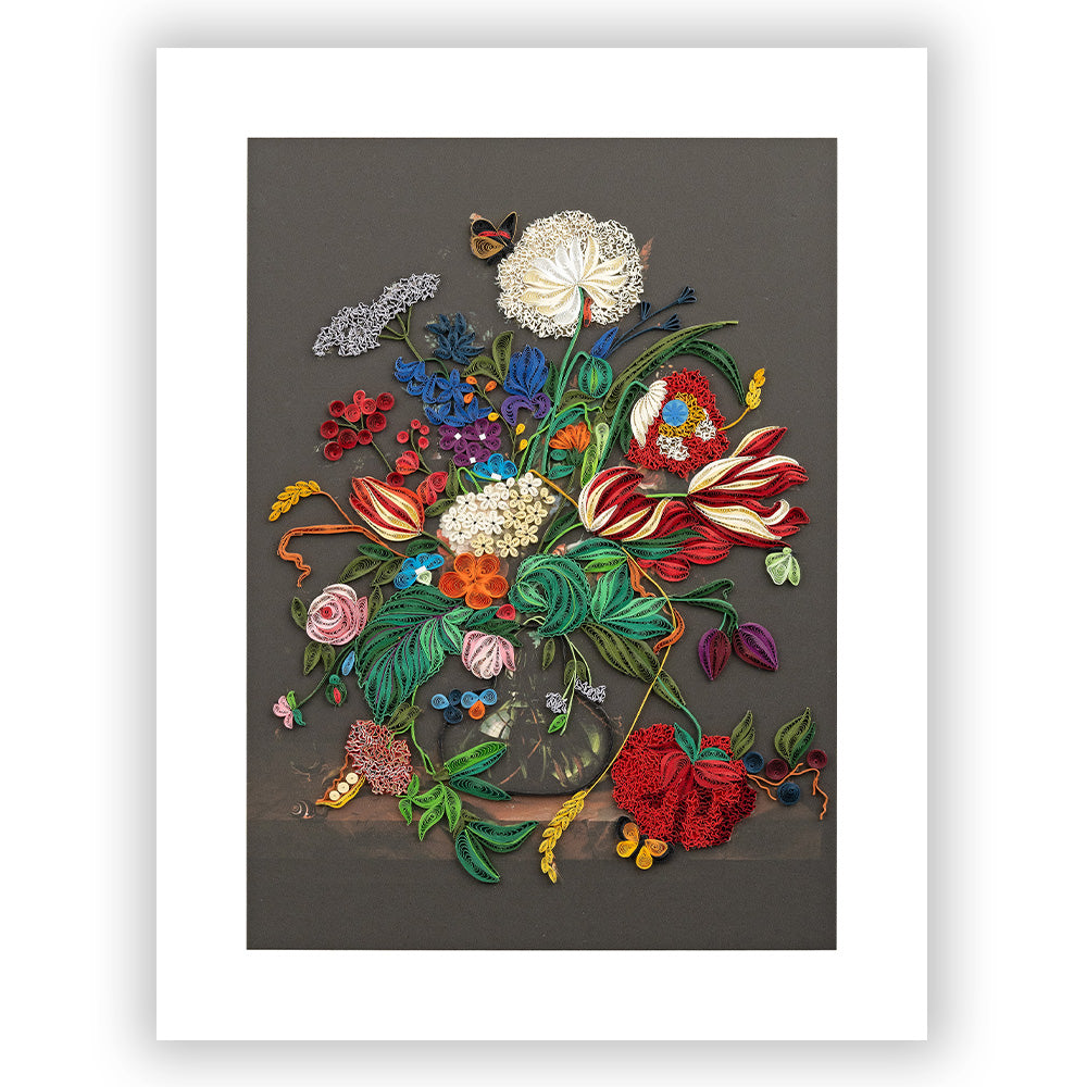Introducing our extravagant quilled wall art inspired by Jan Davidsz. De Heem’s seventeenth century painting “Vase of Flowers.” De Heem’s masterpiece excellently displays the complexity of master brushwork, featuring 31 varying flowers, vegetables, fruits, and insects in vibrant detail. His refined technique allowed him to capture the variety of textures of the subjects before him in a manner that can only be described as romantic.