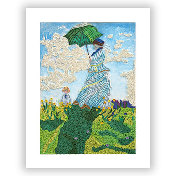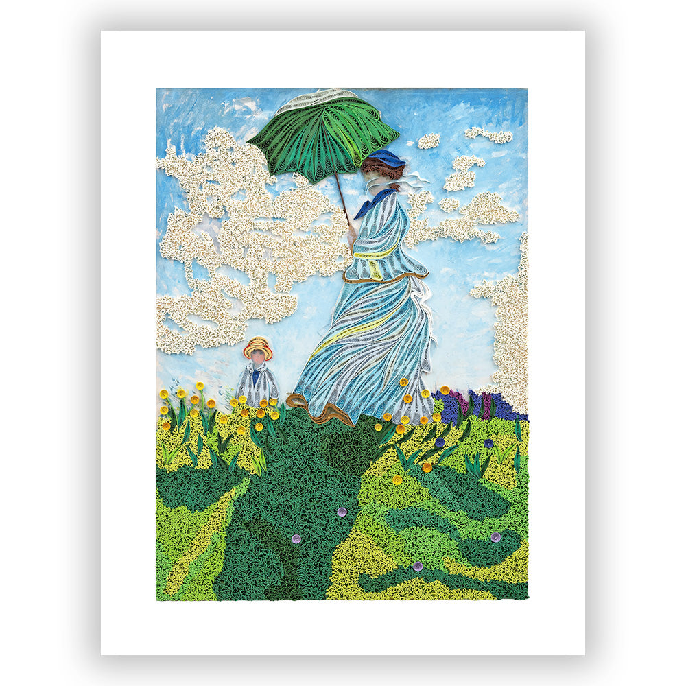 Introducing our breathtaking quilled wall art piece of one of Monet’s most celebrated works of art, “Woman with a Parasol,” also known as “Madame Monet and Her Son.” Painted in 1875, this piece is a true masterpiece of the Impressionist movement, capturing the transitory beauty of a moment with his family with remarkable skill and sensitivity to detail. Monet's style masterfully depicts a sense of motion and fluidity in his paintings, and "Woman with a Parasol" brilliantly exemplifies this technique in the way you can almost feel the gentle breeze brushing against Camille's flowing dress and tall grass. Monet’s genius cannot be understated.