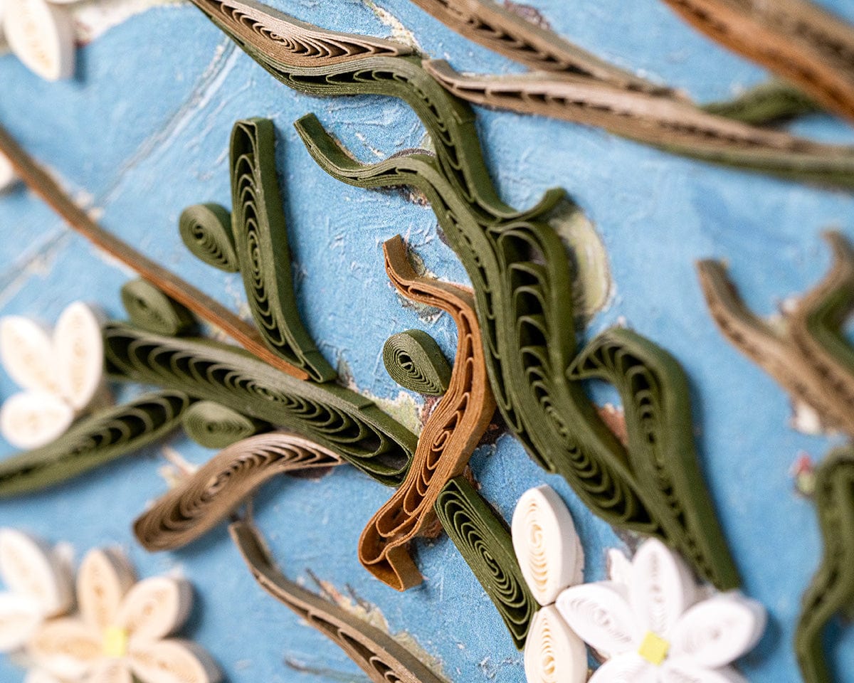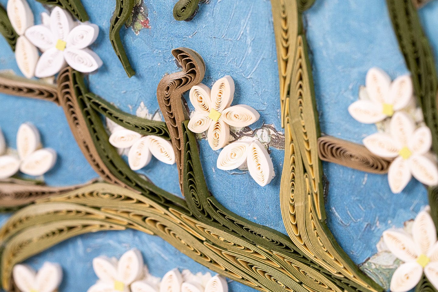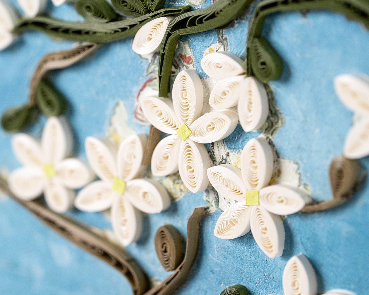 Introducing our exquisite quilled framed art piece, Almond Blossoms. This stunning masterpiece was painted by Vincent van Gogh in 1890. The painting was inspired by Japanese printmaking and depicts white almond blossom branches against a vibrant blue sky. Van Gogh created this painting as a gift for his brother and sister in-law to celebrate the birth of their son who they named, Vincent, after him.