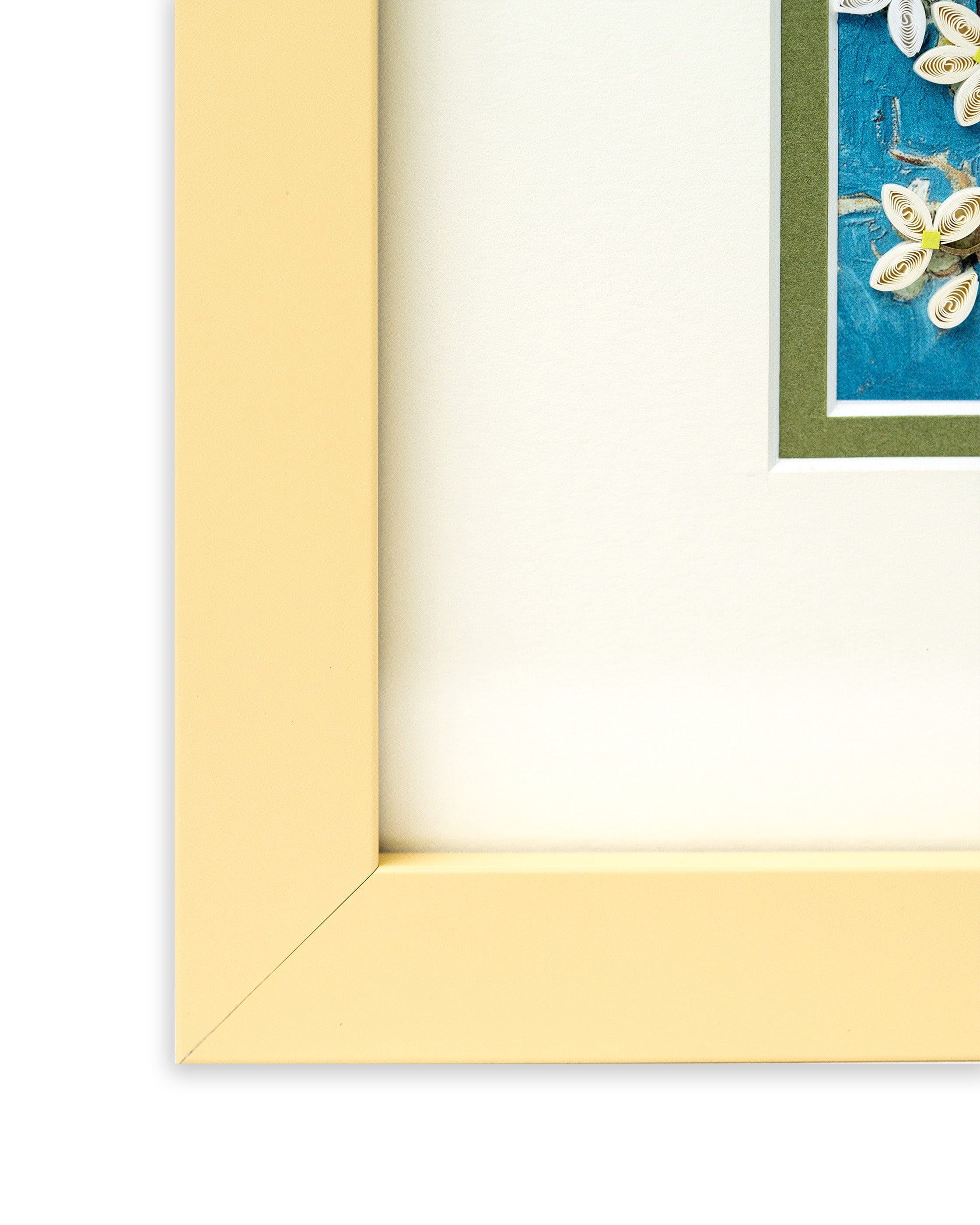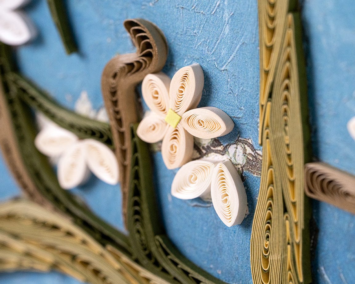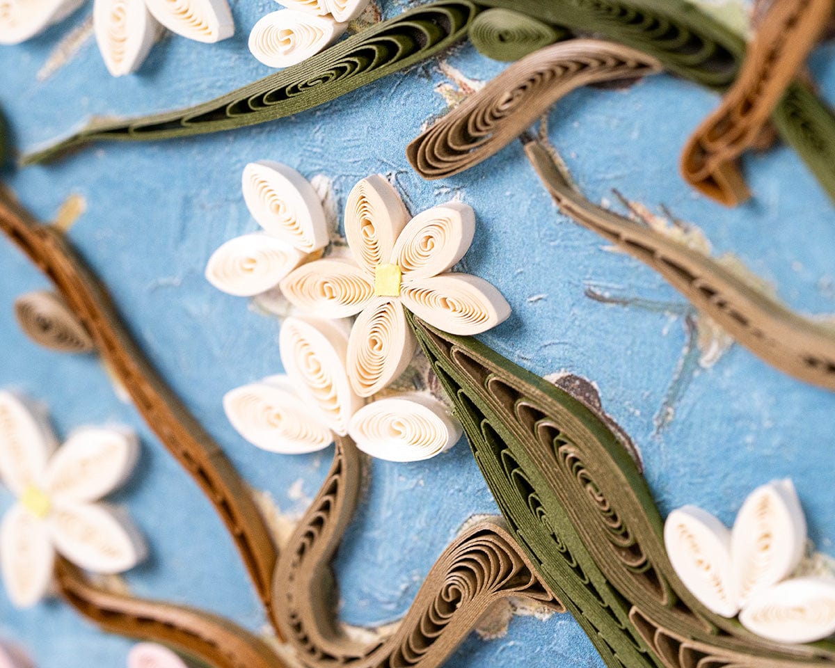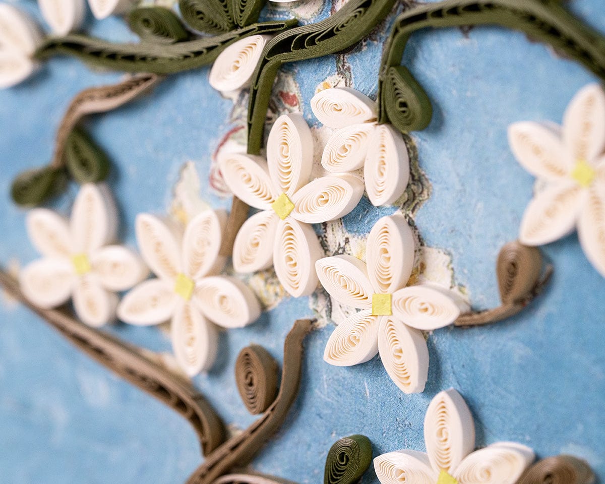 Introducing our exquisite quilled framed art piece, Almond Blossoms. This stunning masterpiece was painted by Vincent van Gogh in 1890. The painting was inspired by Japanese printmaking and depicts white almond blossom branches against a vibrant blue sky. Van Gogh created this painting as a gift for his brother and sister in-law to celebrate the birth of their son who they named, Vincent, after him.