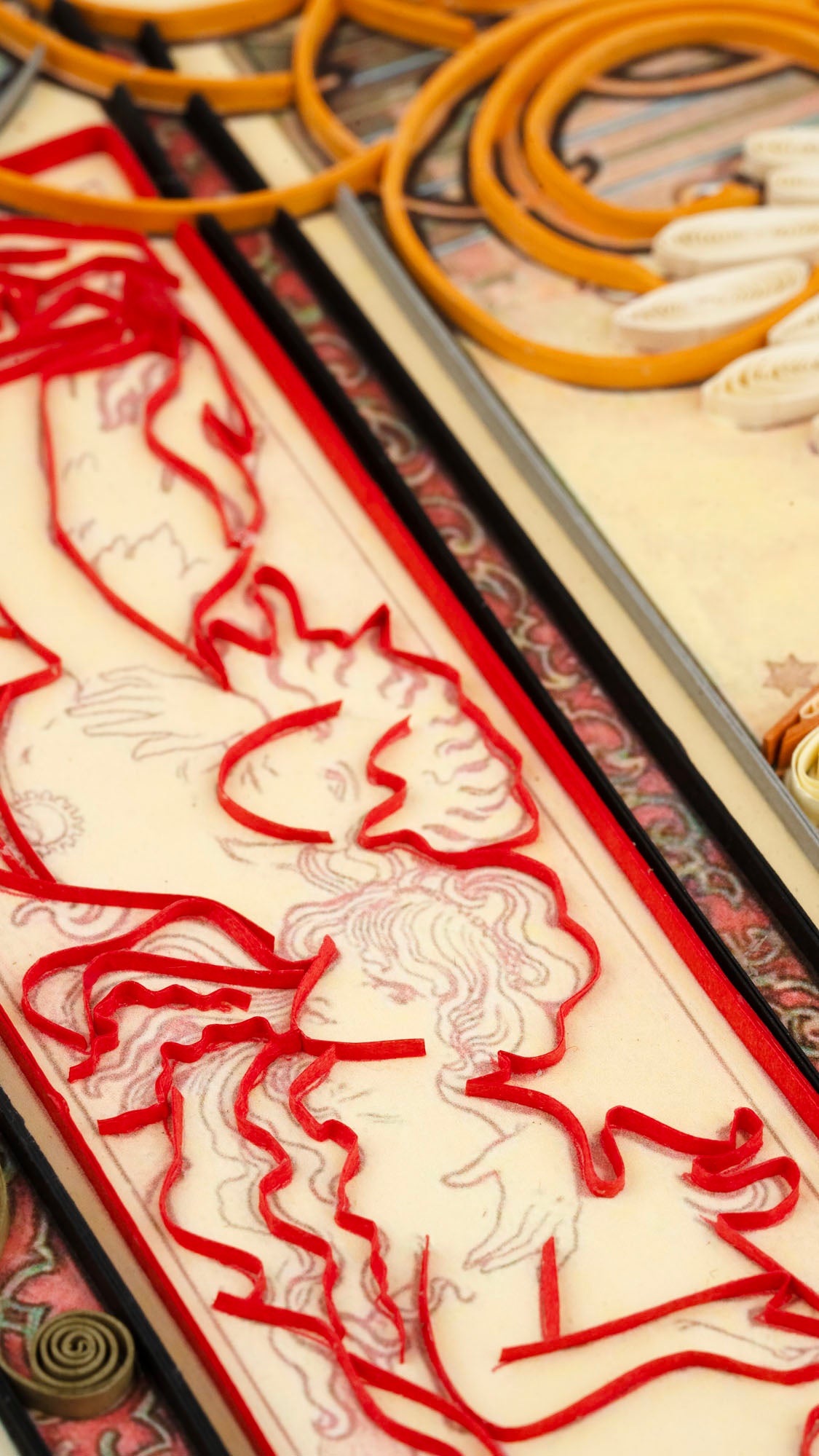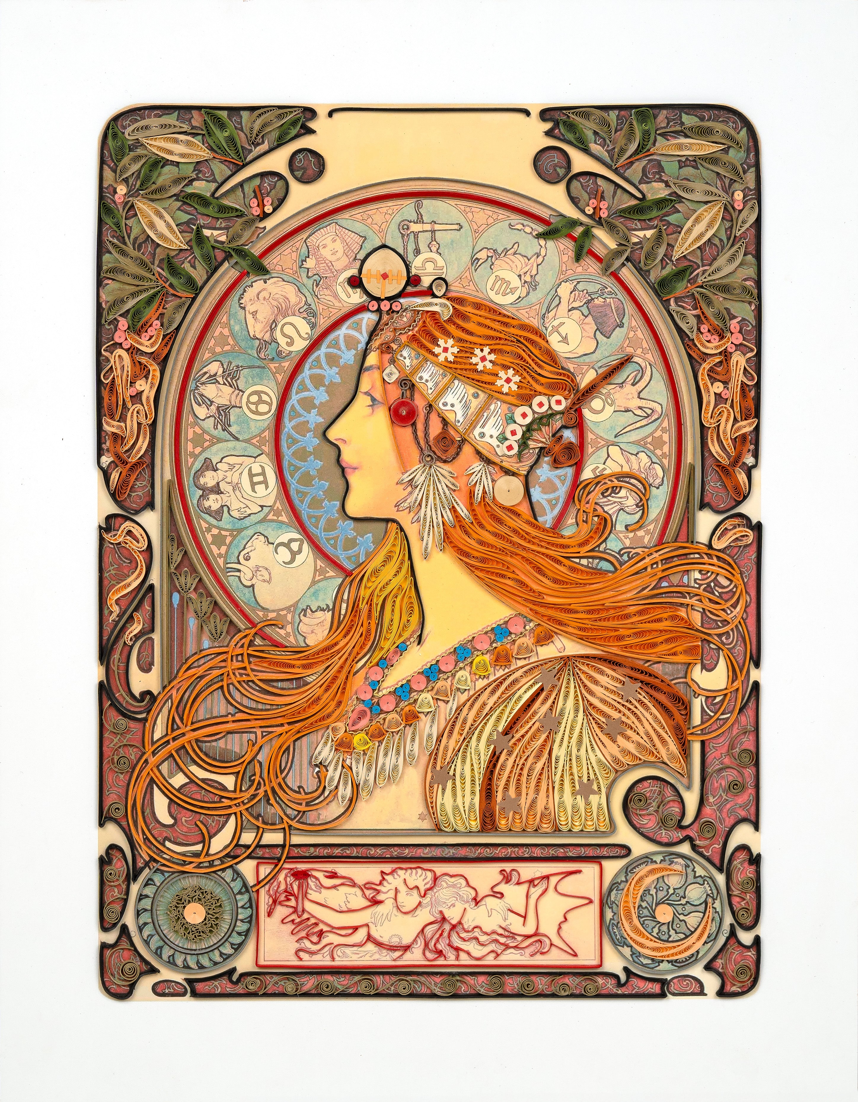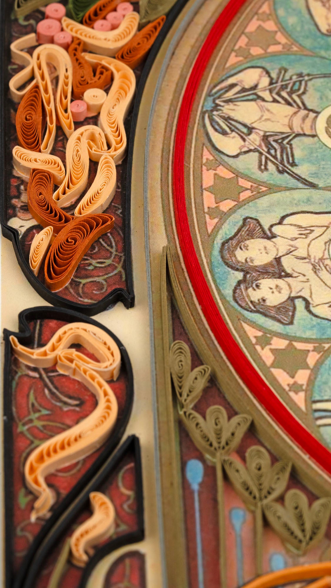 • Hand-rolled paper strips in carefully selected earth tones, golds, and jewel colors that honor Mucha's rich palette