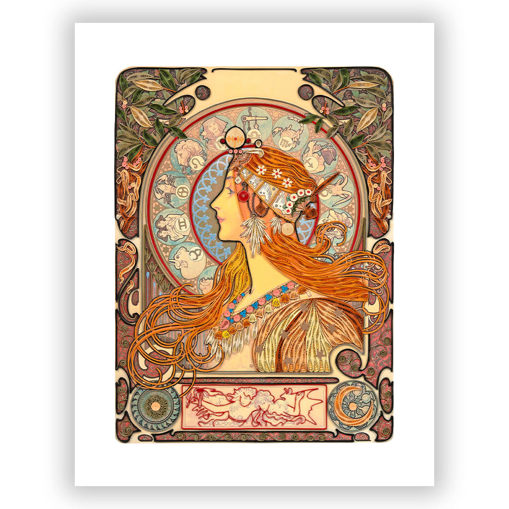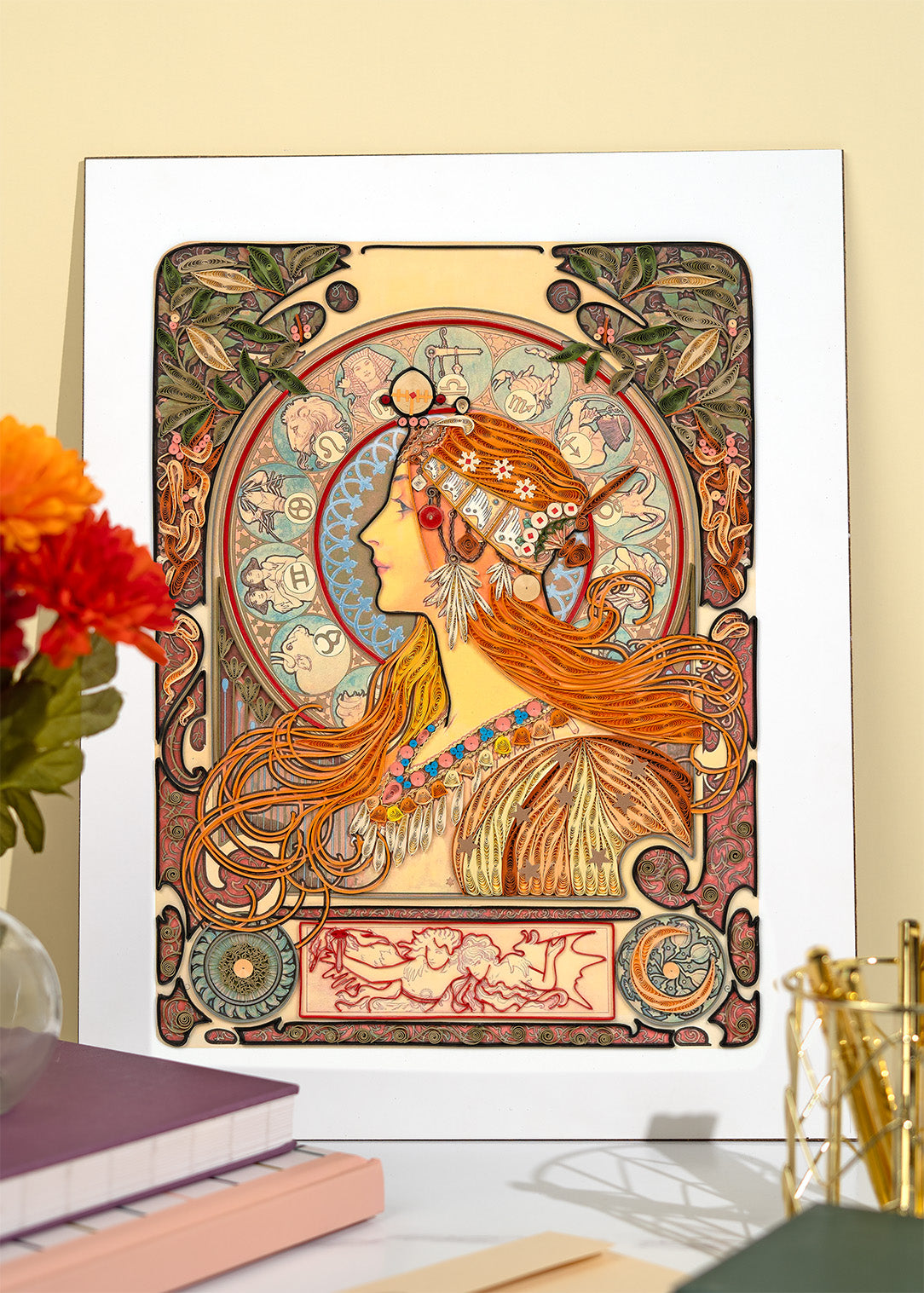 Unlike a flat reproduction, this quilled interpretation adds texture and depth that invites closer inspection. The interplay of light and shadow across the raised paper elements creates an ever-changing visual experience, making the zodiacal symbols seem to shimmer and the figure's hair appear to flow with celestial energy, bringing Mucha's timeless cosmic beauty vibrantly alive in your space.
