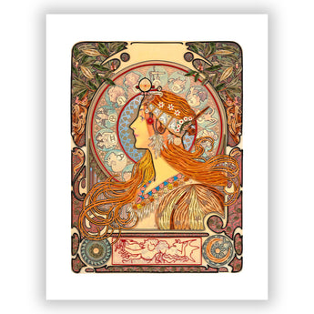 Originally created as a decorative panel showcasing the twelve signs of the zodiac, this artwork represents Mucha's mastery of symbolic Art Nouveau design. The central female figure, adorned with flowing auburn hair and celestial ornaments, is surrounded by an intricate circular arrangement of zodiacal symbols. Mucha's genius shines through his ability to blend mystical symbolism with decorative beauty, creating a work that captures both the mystery of astrology and the elegance of the Belle Époque era.