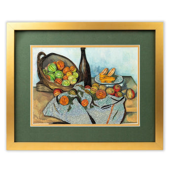 Elevate any space with our quilled wall art The Basket of Apples. This notable still-life painting by French Post-Paul Cézanne, was created in 1895. This artwork is celebrated for its innovative approach to form and color, as Cézanne used geometric shapes and multiple perspectives to depict the apples and other objects.