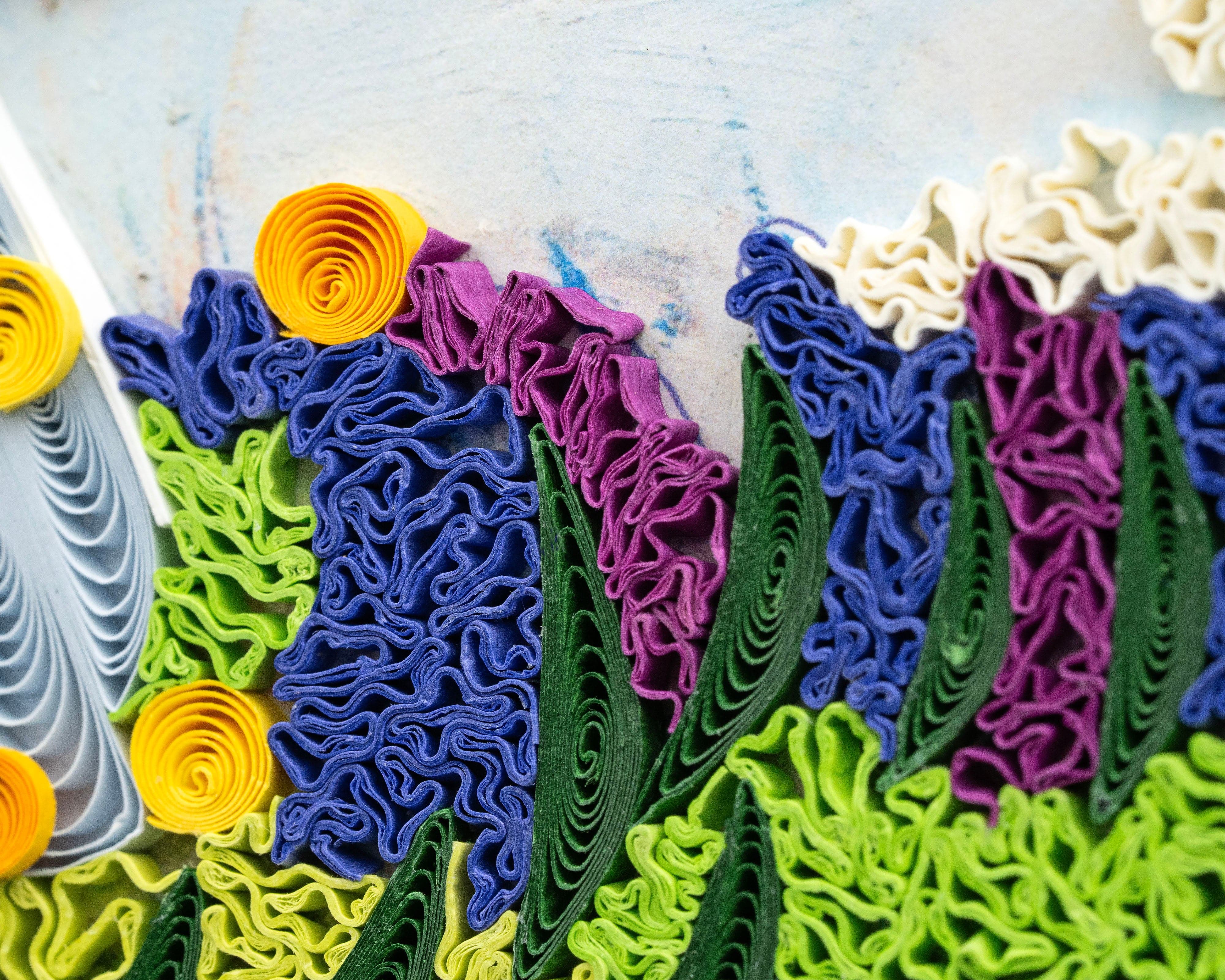 Introducing our stunning framed quilled wall art piece, inspired by Vincent Van Gogh’s “Irises.”