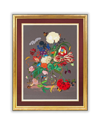 Jan Davidsz. de Heem was a 17th century Dutch still life painter and was a prominent figure during the Dutch Golden Age, a point in time where the Netherlands achieved great feats in the arts, science, and military. Painted circa 1660, "Vase of Flowers" excellently displays the complexity of de Heems' brushwork, featuring 31 varying flowers, vegetables, fruits, and insects in vibrant detail. What makes "Vase of Flowers" so unique is that this bouquet could never have existed. The blooming cycles would have prevented this bouquet from ever existing, thus highlighting de Heems' impeccable ability to create life-like paintings from memory. Some of the flowers include the newly imported tulip from Turkey in red and white on the right, an anemone with a bright blue center above them, a white hydrangea on the left, and a large, feather white peony sitting atop the bouquet.