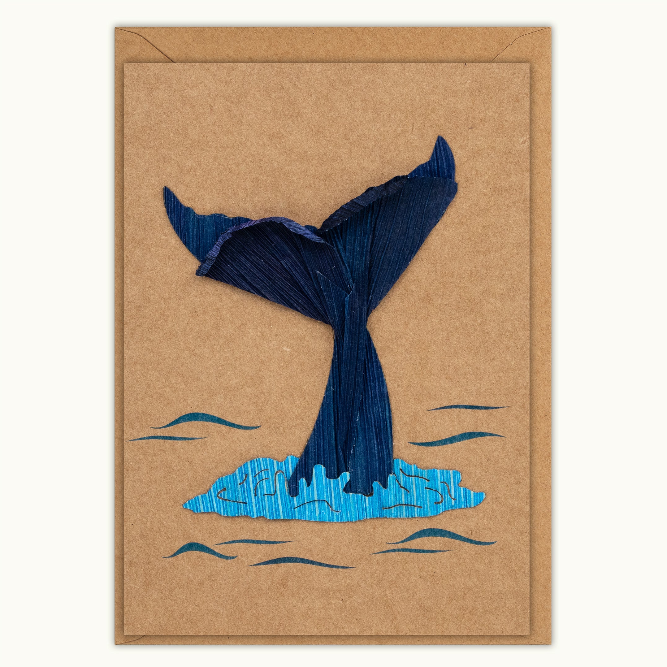This whale tail card features a coastal whale tail rising from calm water, handcrafted from upcycled corn husks by Vietnamese artisans. Each design reflects hand-crafted botanical art, earth-rooted artistry, and eco-friendly craftsmanship.