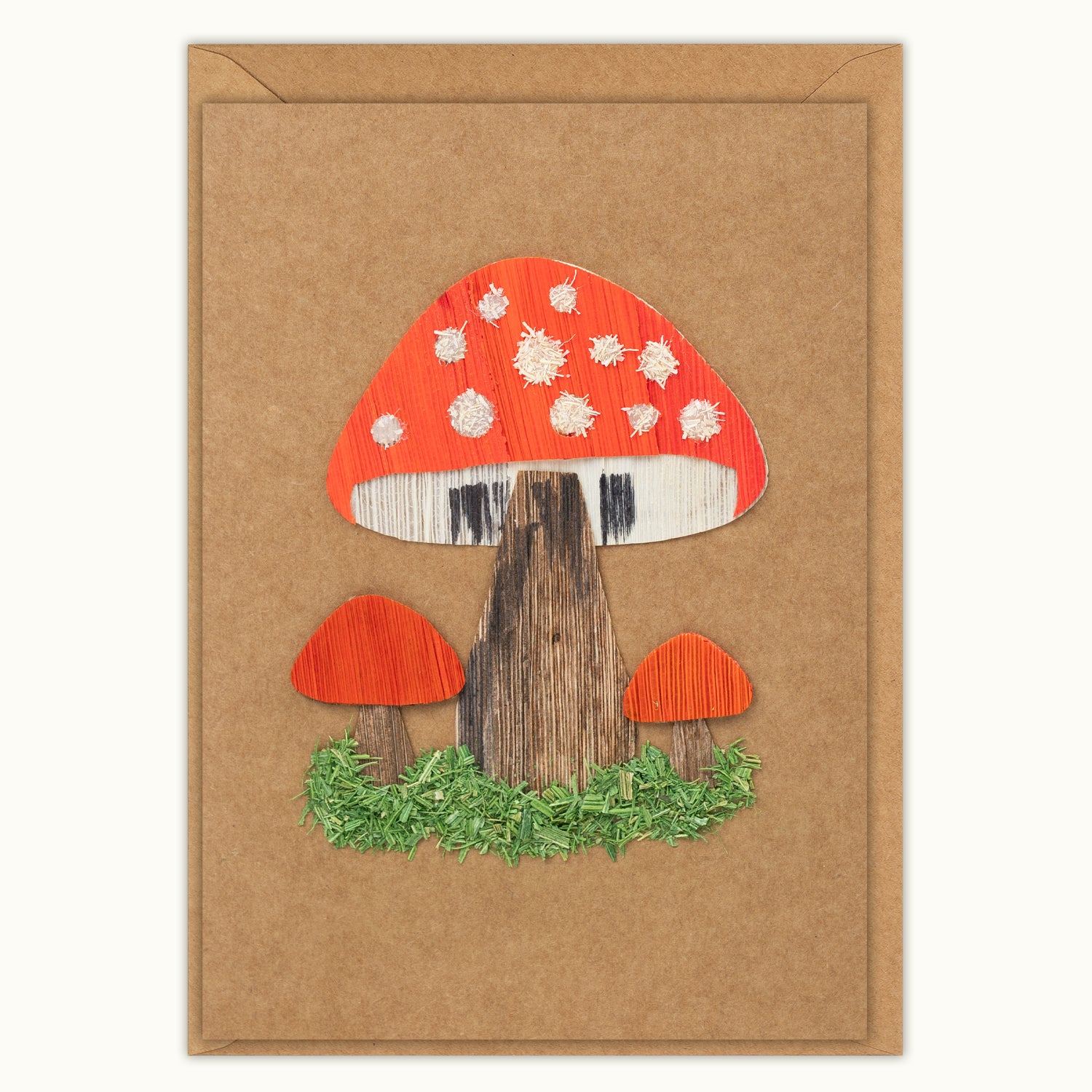 This wild mushroom card features a whimsical woodland mushroom design, handcrafted from upcycled corn husks by Vietnamese artisans. Each design reflects hand-crafted botanical art, earth-rooted artistry, and eco-friendly craftsmanship.