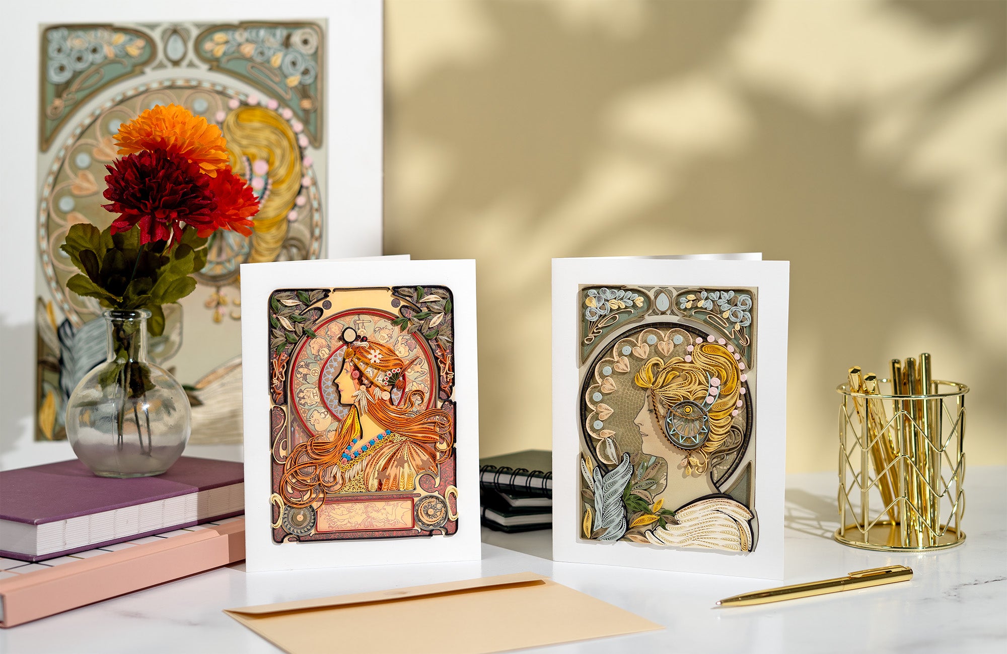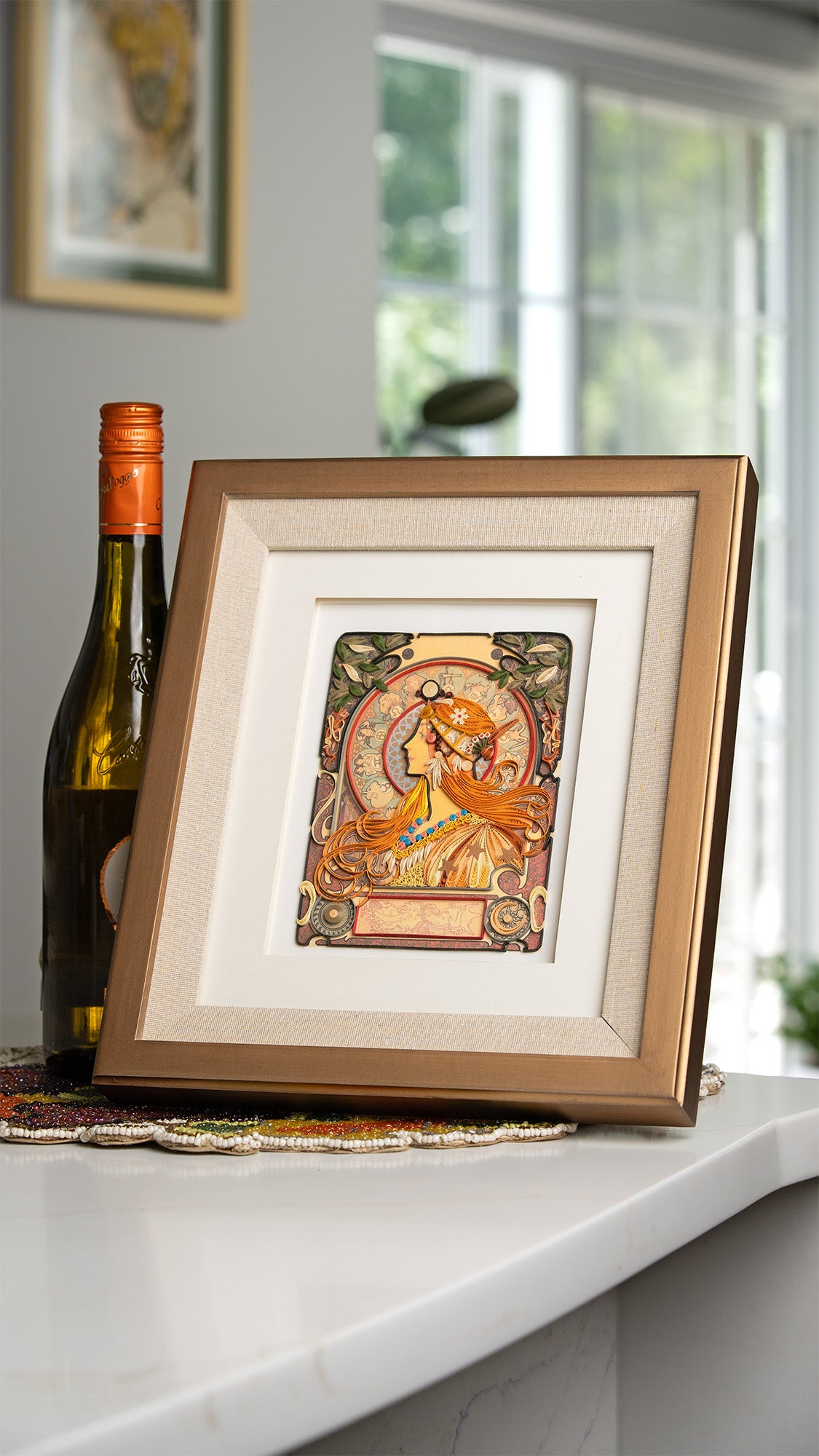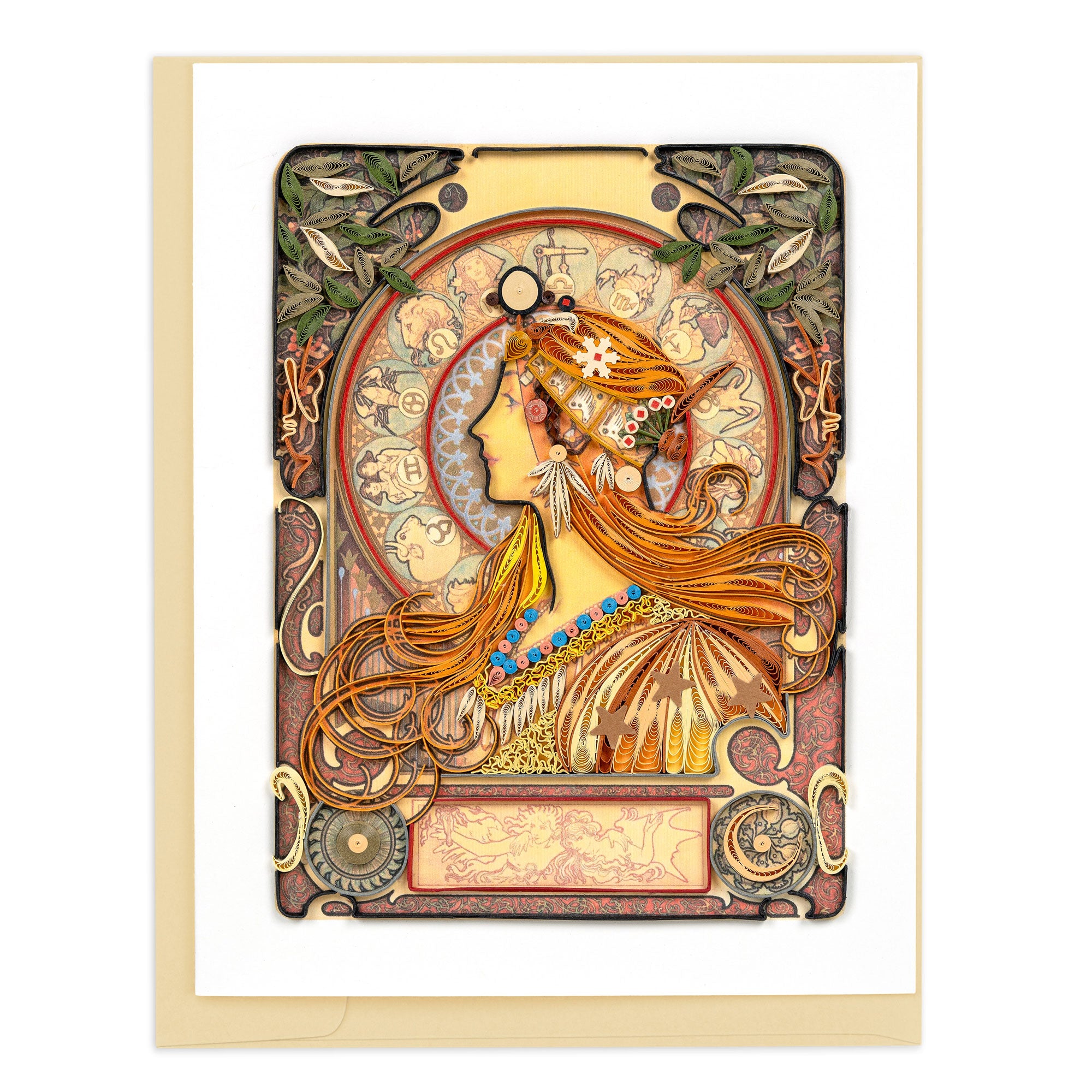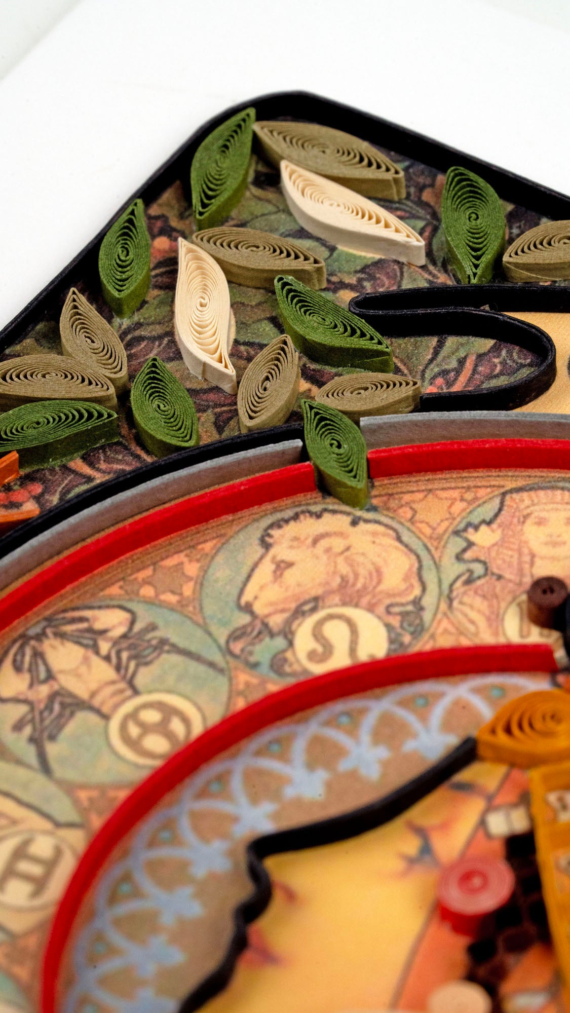 • Hand-rolled paper strips in carefully selected earth tones, golds, and jewel colors that honor Mucha's rich palette