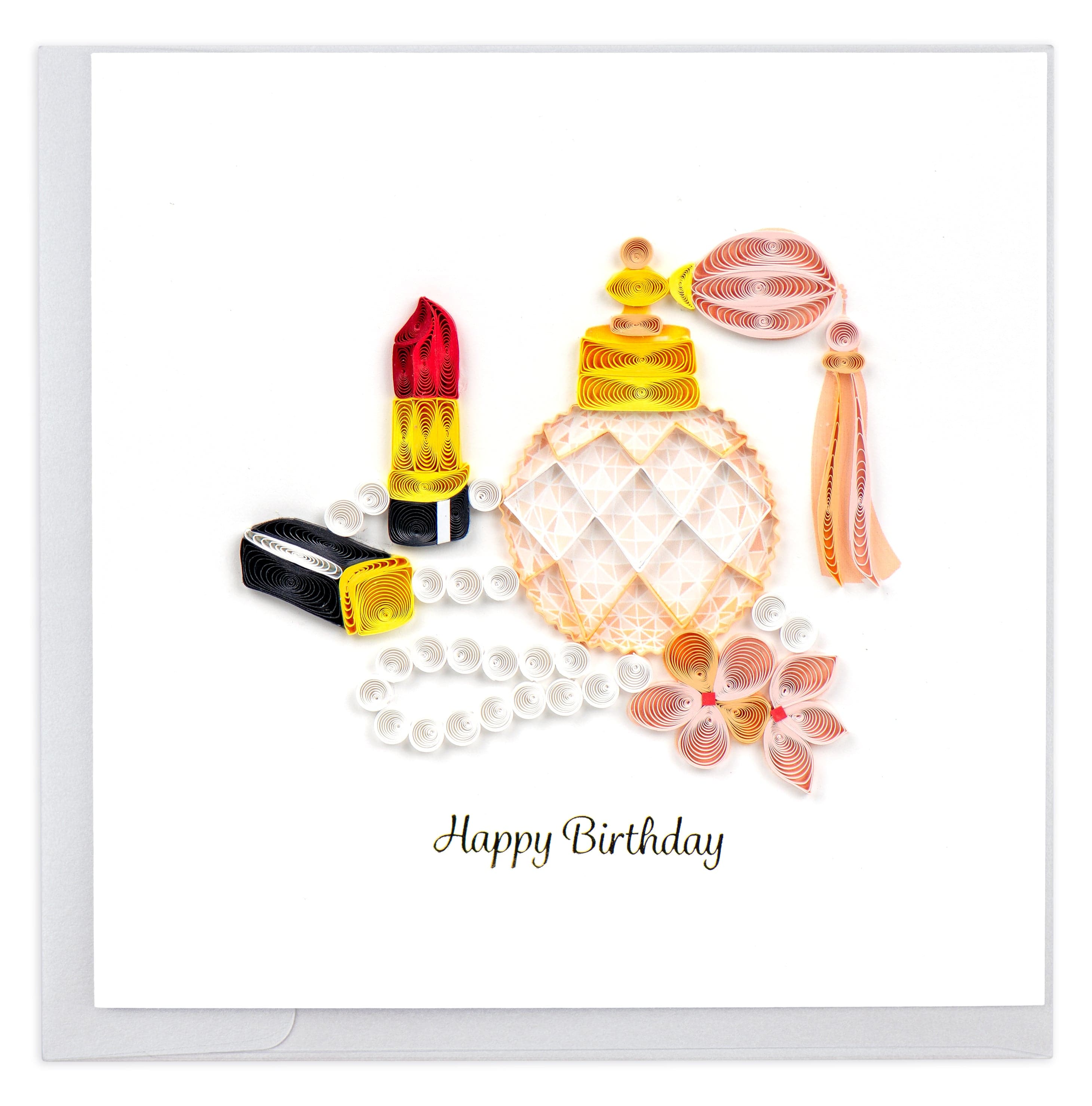 This artwork is perfect your friend or loved one who enjoys the glamourous life! The Quilled Birthday Glam card features a black and yellow lipstick tube and a pink and yellow perfume squeeze bulb. White pearls and a pink flower add an additional splash. The words “Happy Birthday” are written in script under the design.