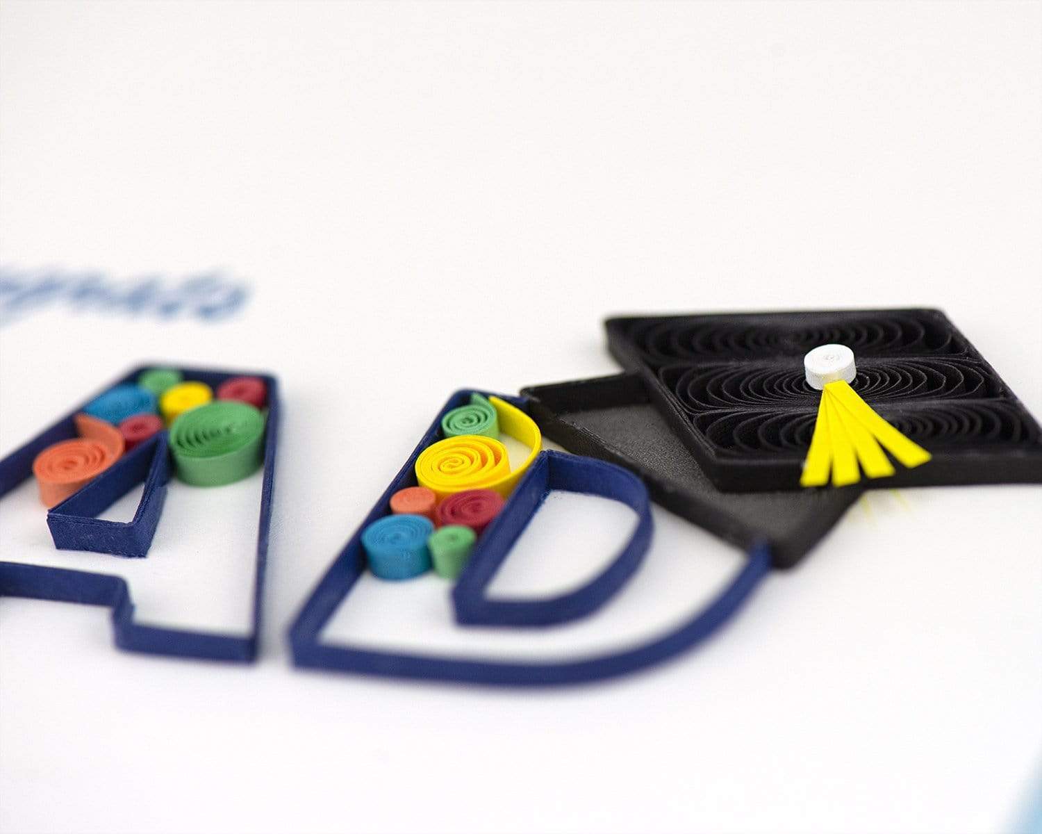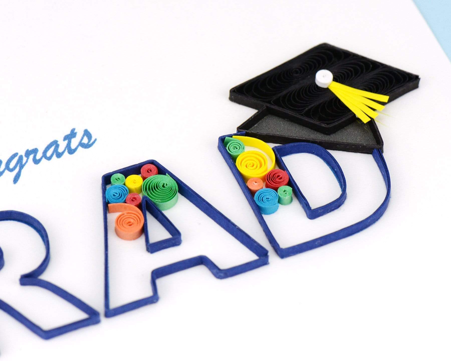 Give your friend or family member the Quilled Congrats Grad Swirl Card, an ideal gift for the recent graduate. This quilled design features the word GRAD with a black graduation cap resting on the letter D, blue, red, yellow, and green swirls, and the word Congrats written in blue lettering.