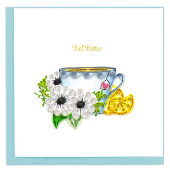 Send your friends and loved ones get well wishes with the quilled Feel Better Card. This card features a teacup with colorful quilled flowers on it, and yellow and green lemon and lime slices at the base of the cup. The words, feel better are written above the design