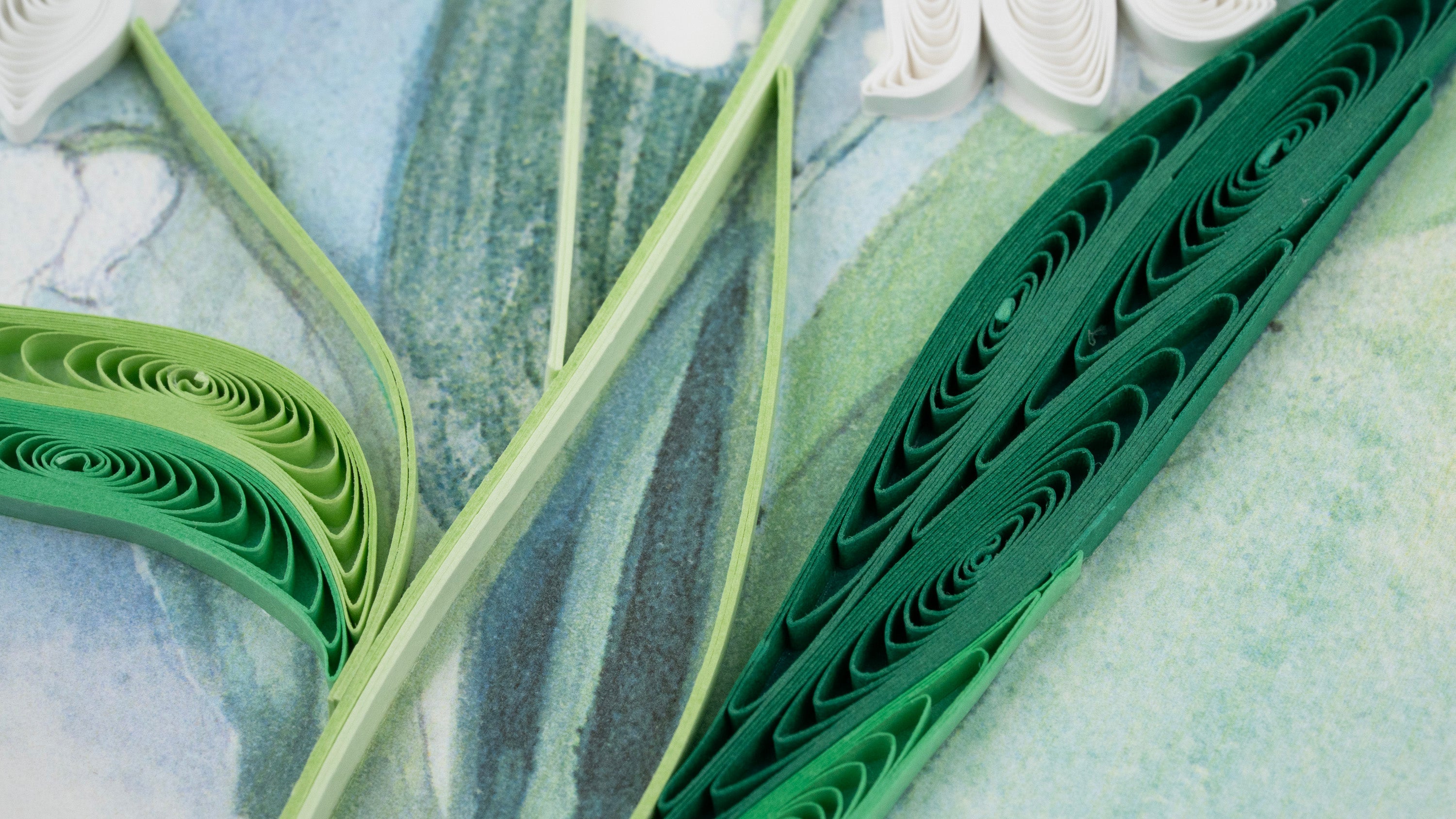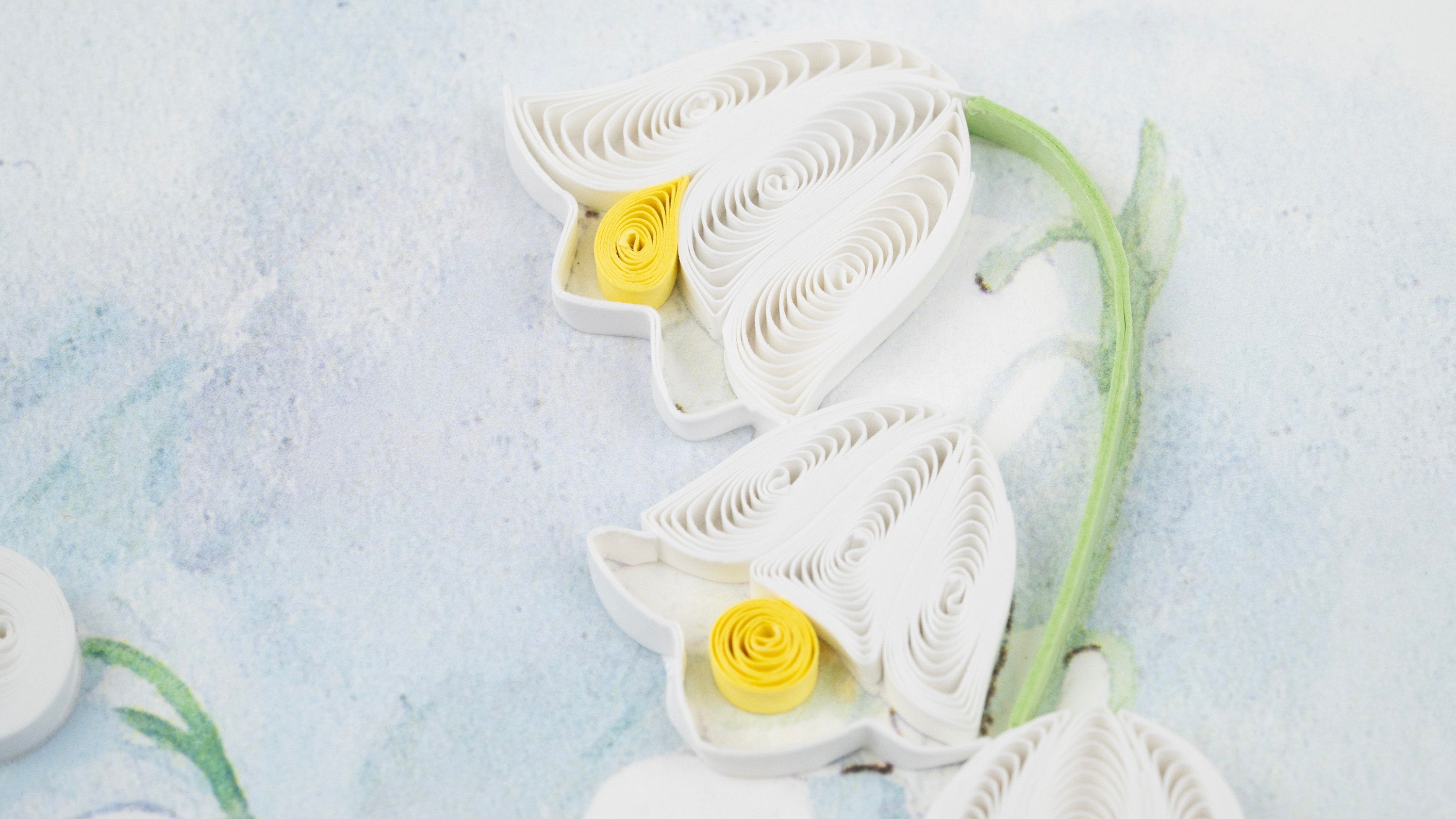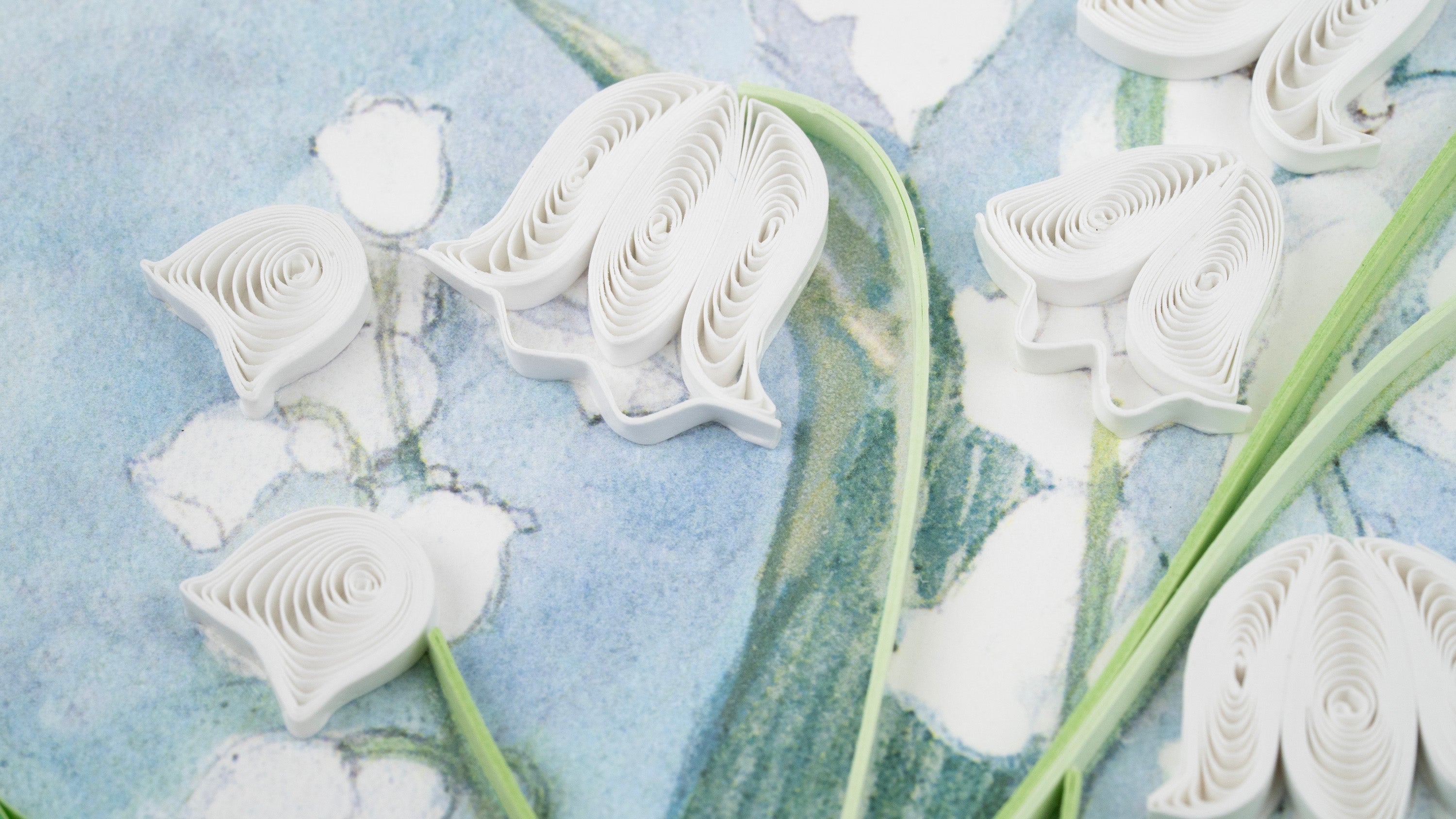 Delicate lily of the valley sprigs unfold in hand-quilled artistry, each petal and leaf meticulously crafted and layered for dimensional beauty. This greeting card celebrates nature's quiet elegance with premium cardstock and a timeless design perfect for spring occasions, sympathy, or simply sharing appreciation for fine craftsmanship.