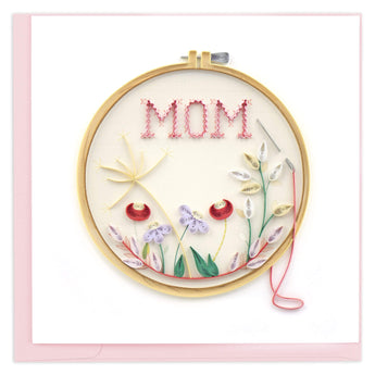 This design will have mom in stitches! The Quilled Mother’s Day Cross Stitch Card makes a thoughtful gift for any mom. This design features a hoop with a cross-stitched design of the words “MOM” and red, purple, pink, and yellow flowers.