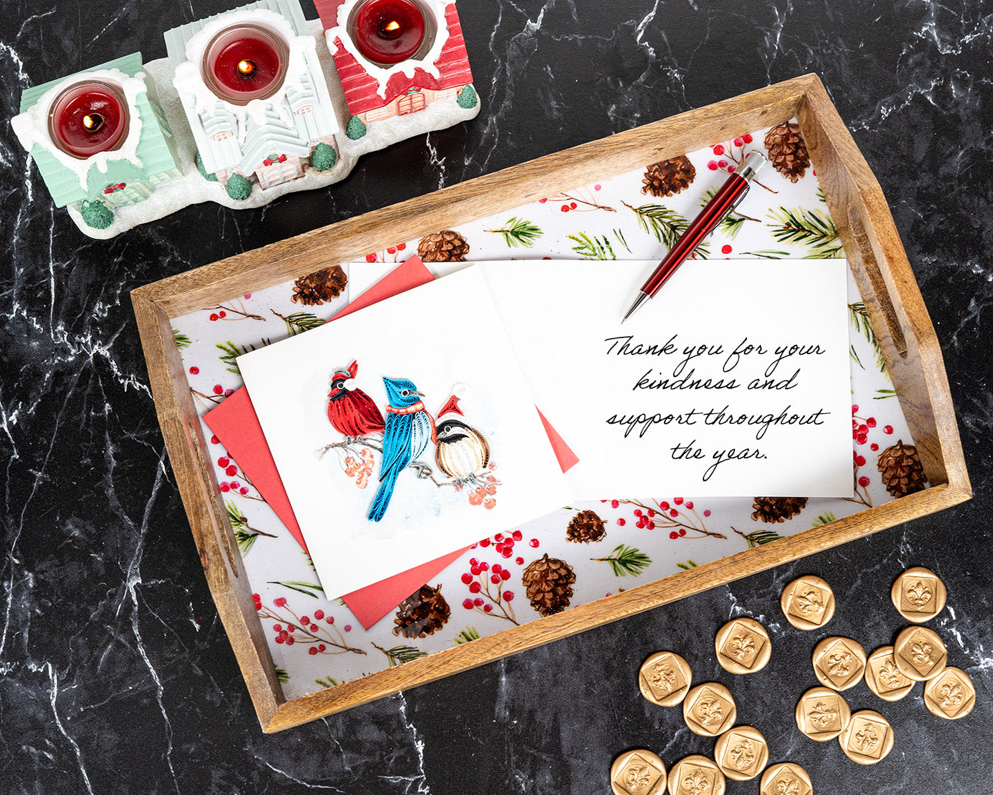 Send season's greetings with the Quilled Snowbirds Holiday Card. This design features three birds decorated with scarves and other winter attire.
